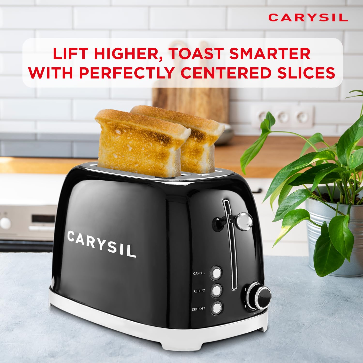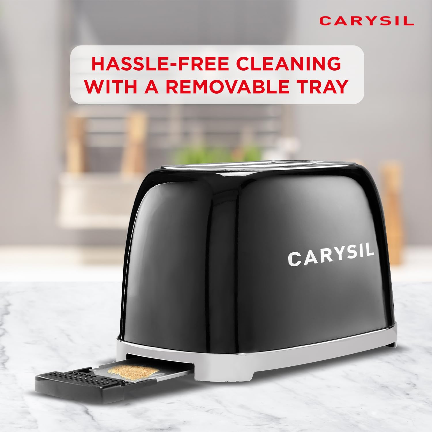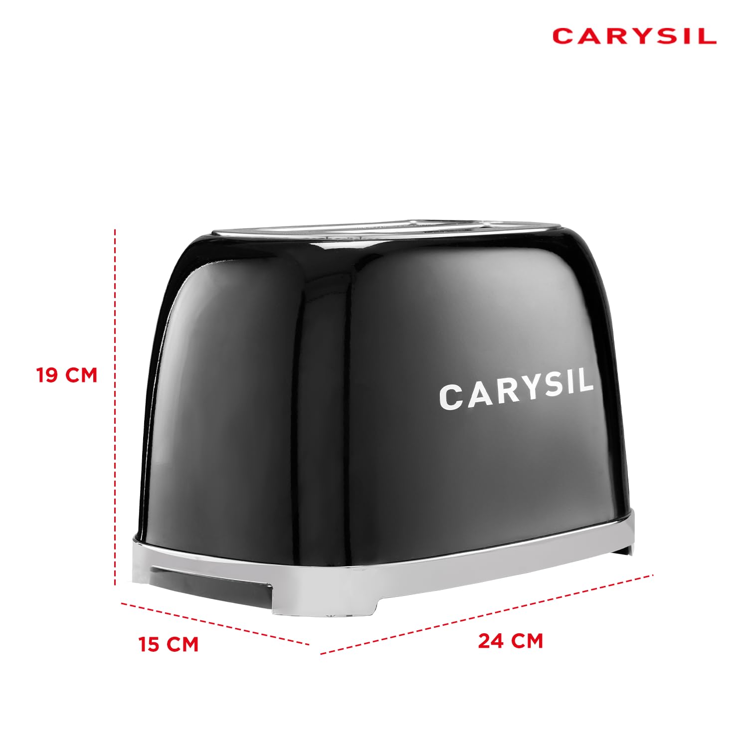 The Carysil 2-Slice Toaster features a vintage-inspired design with a sleek black finish, adding a nostalgic touch to any kitchen. Its timeless look complements modern and classic décors, making it a stylish and functional addition to your countertop
