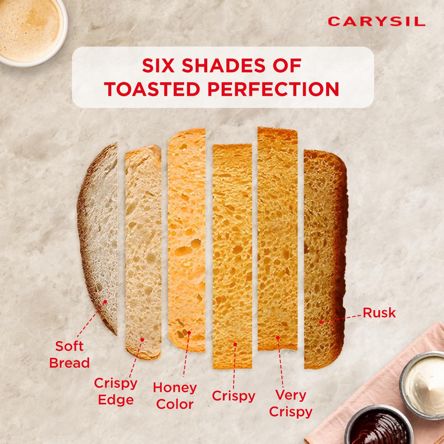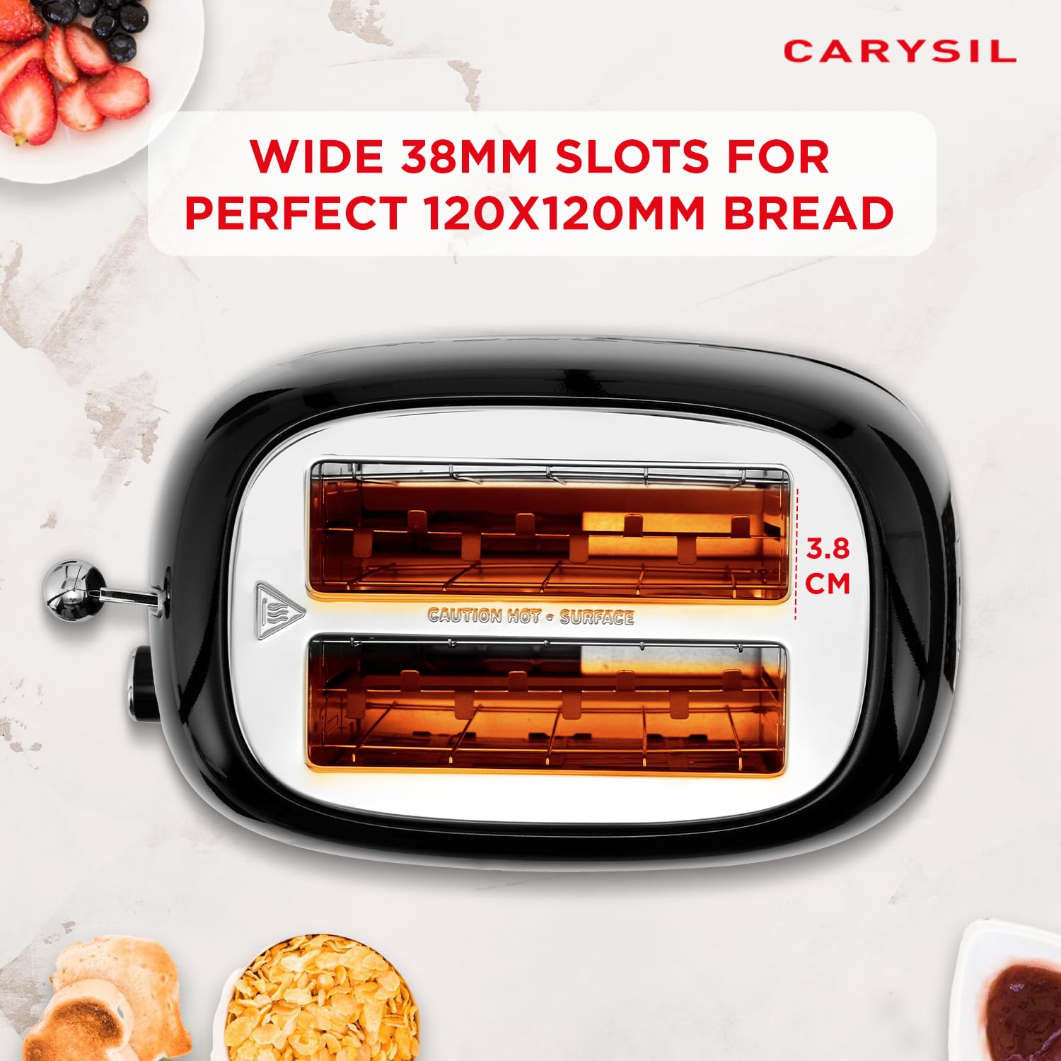 The Carysil 2-Slice Toaster features wide 38mm slots, perfect for toasting thick slices of bread, bagels, and waffles. With this extra-wide toaster, you no longer have to worry about uneven toasting or struggling to fit larger bread slices