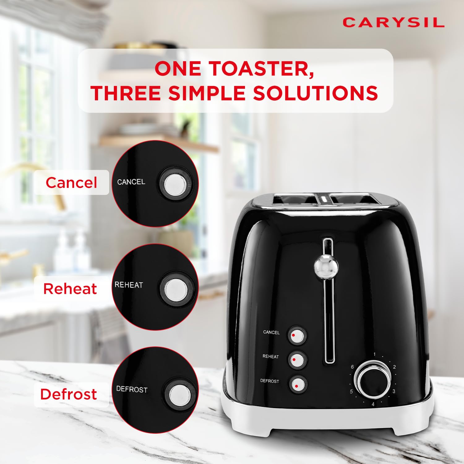 The Carysil 2-Slice Toaster features Defrost, Reheat, and Cancel functions, making it versatile for all your toasting needs. Defrost thaws frozen bread or bagels, Reheat warms toasted bread without over-browning, and Cancel stops the toasting process instantly. Each function is clearly indicated with LED red lighting, ensuring easy operation and control.