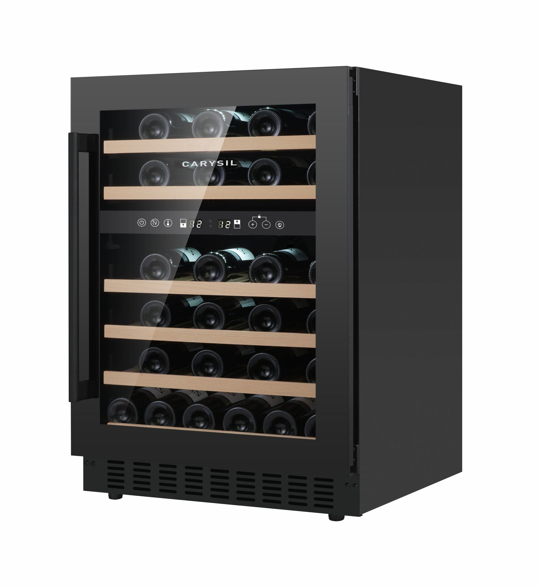 The Carysil Wine Chiller is separated into two compartments, each with two different temperature control panels that lets you adjust temperatures between 12°C to 20°C for red wines and 3°C to 12°C for white wines. It includes LED lights for enhanced visibility and features high precision compressor cooling for effective performance.