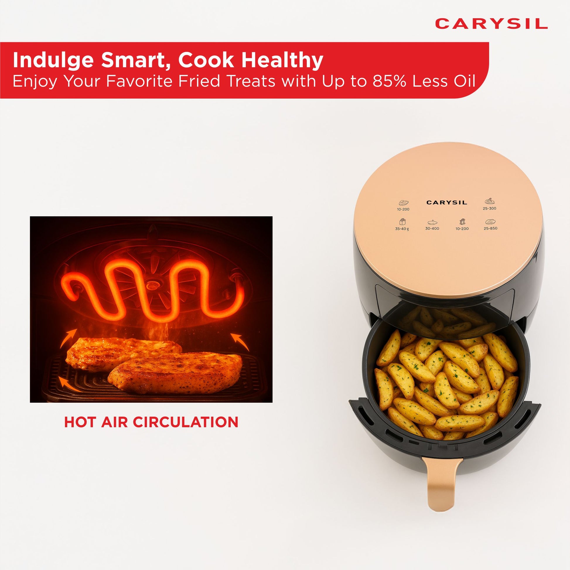 Featuring rapid hot air circulation, the Carysil Air Fryer ensures that your food cooks evenly, delivering crispy and perfectly cooked meals every time.