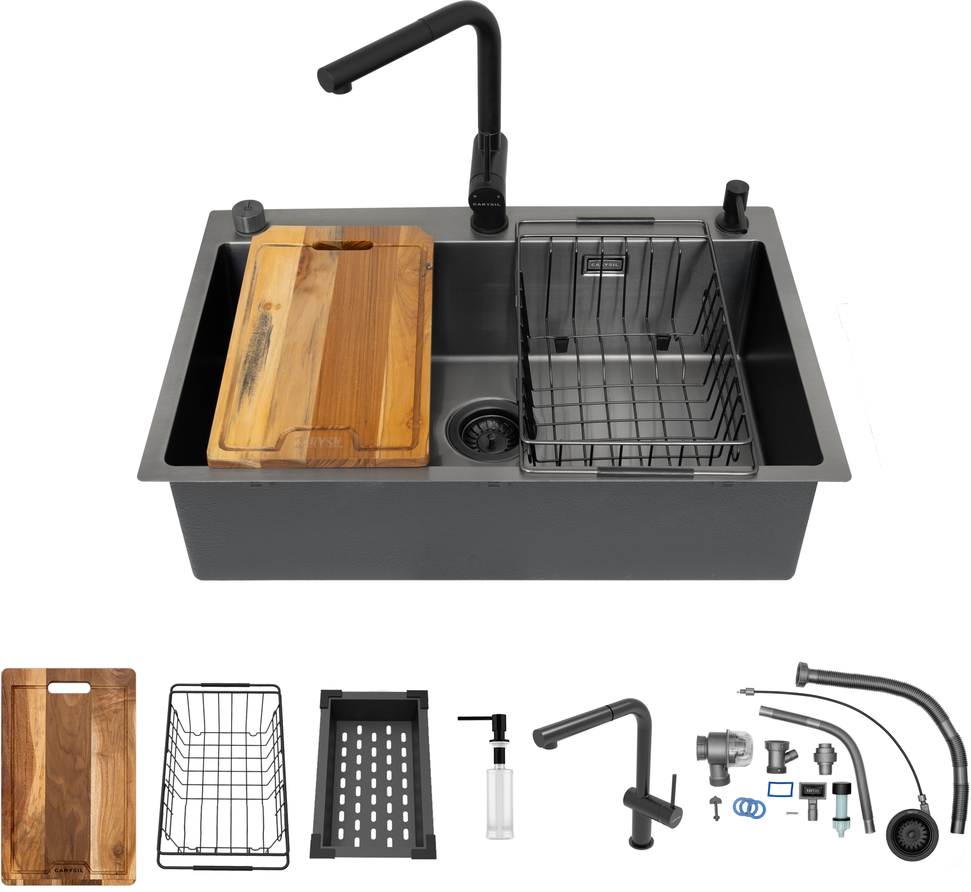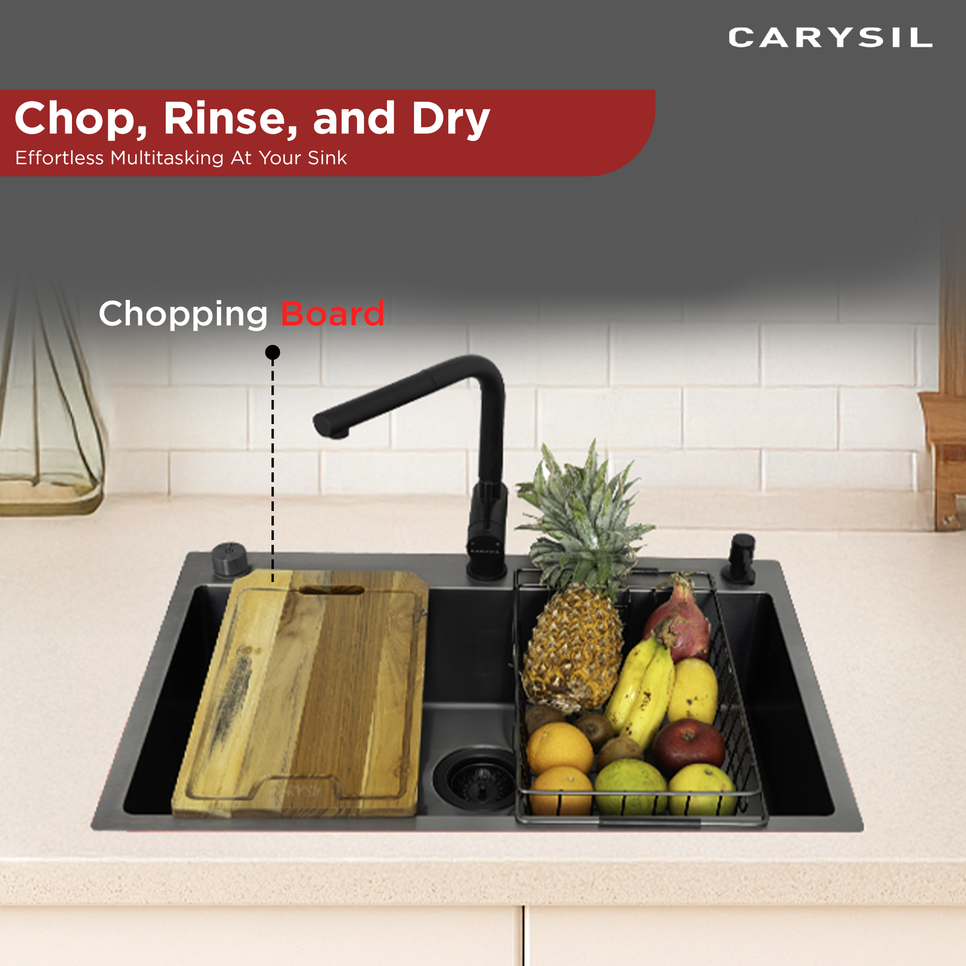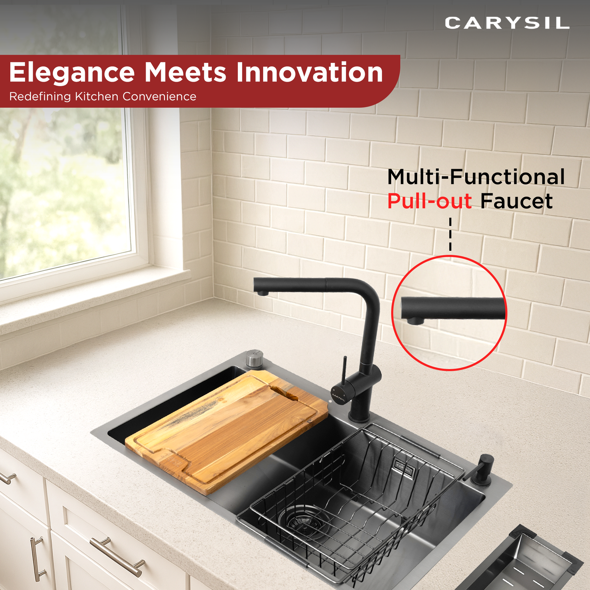 This kitchen sink comes equipped with an integrated pull-out faucet, built-in soap dispenser, fold mat, teak wood chopping board, and colander, offering a complete solution for an organized and efficient kitchen experience.
