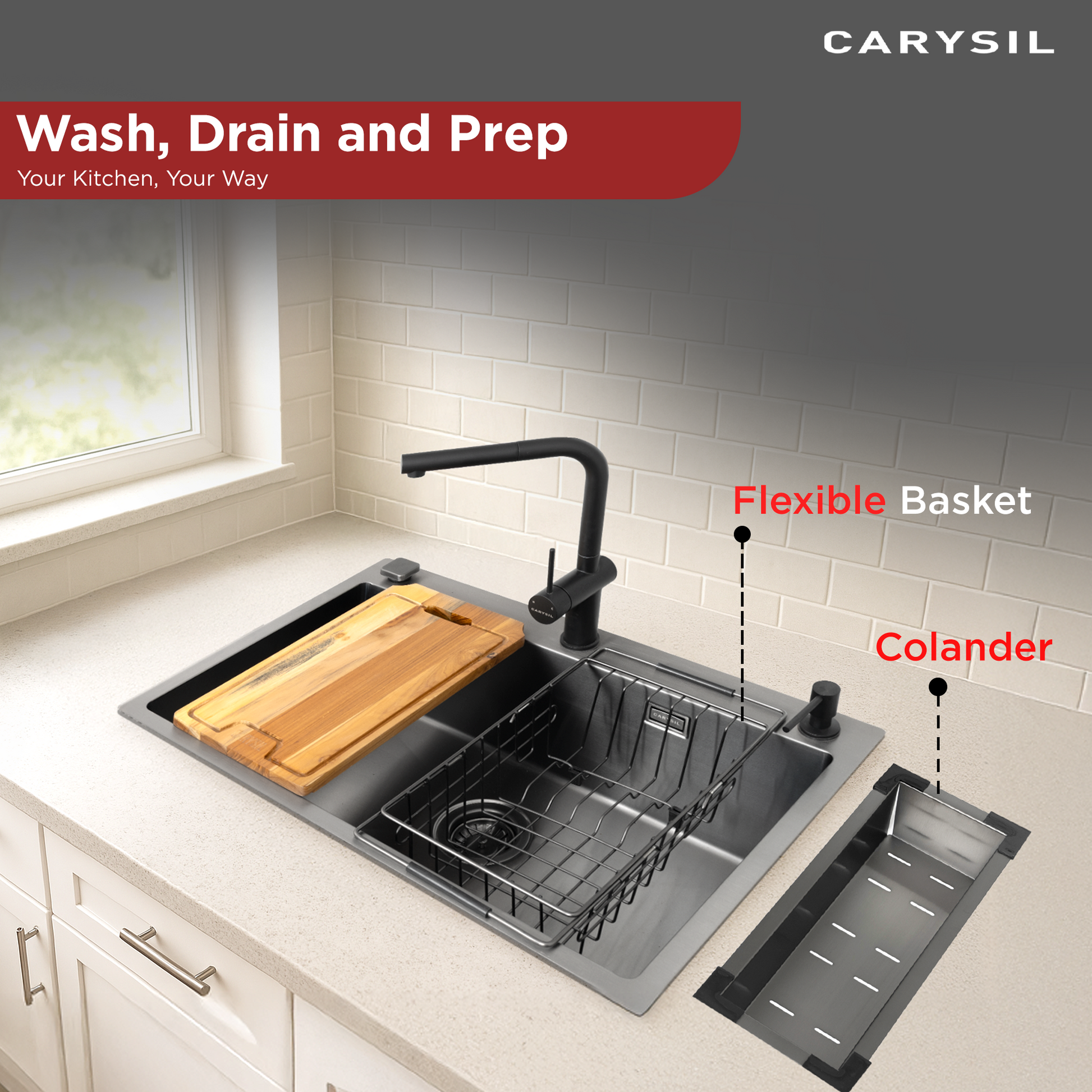 Special foam material noise-reduction pads in this Carysil workstation kitchen sink minimize the sound of running water and dishwashing, creating a quieter and more comfortable kitchen atmosphere.