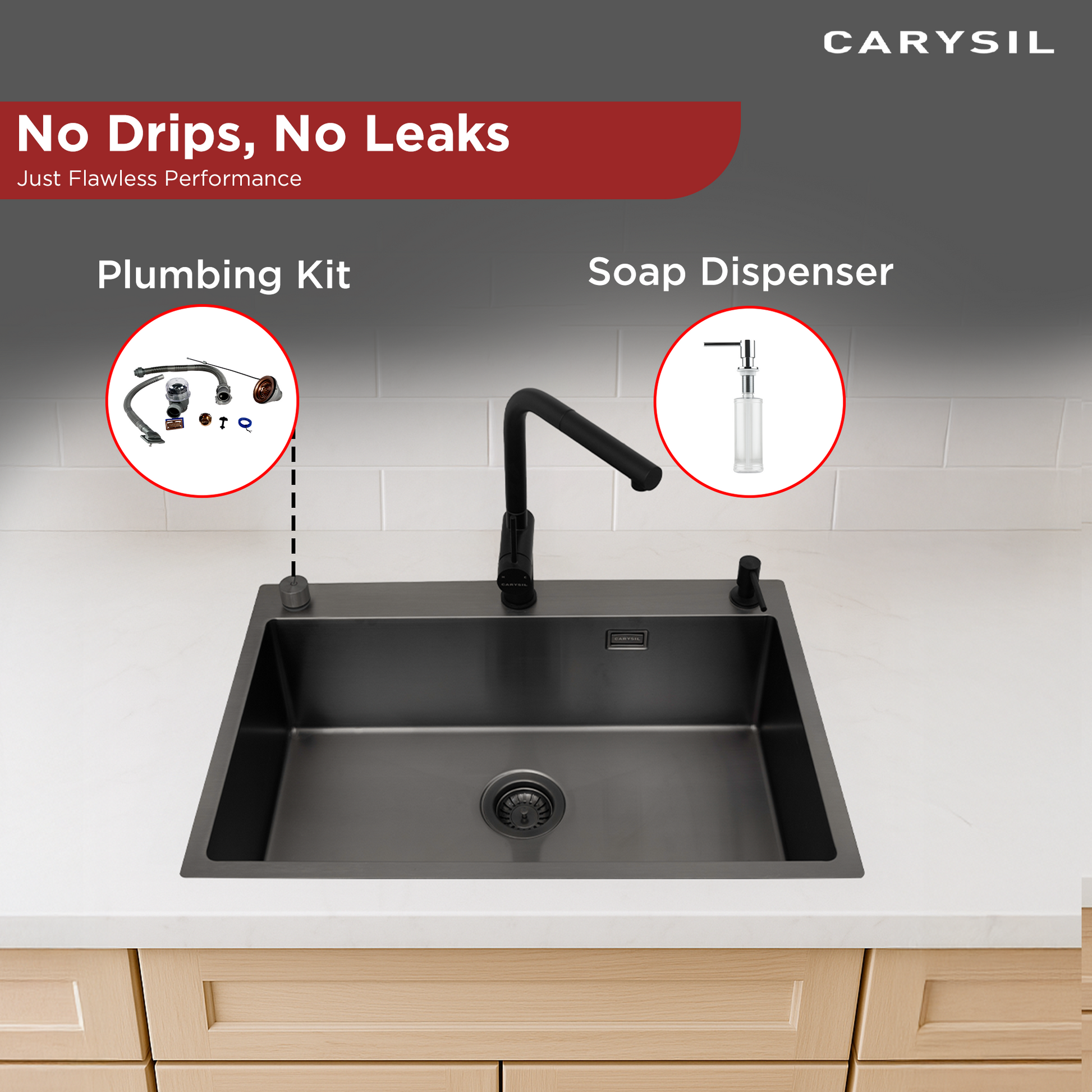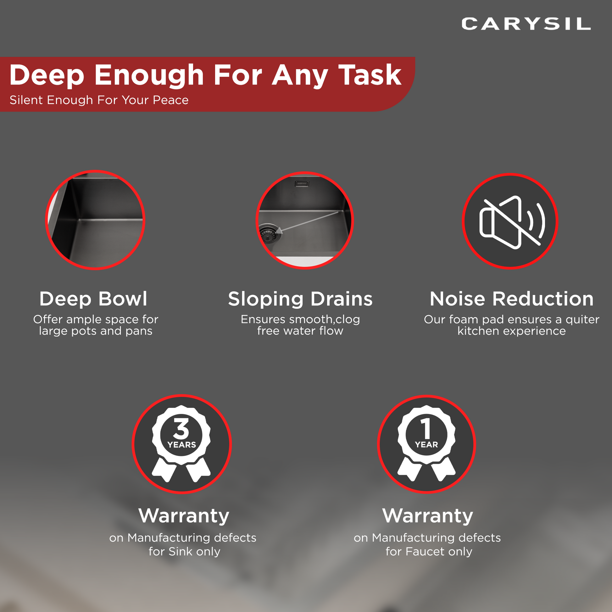 The Carysil stainless steel sink in gun metal finish comes with a 3-year warranty and the Carysil pull-out faucet in gun metal finish comes with a 1-year warranty, ensuring peace of mind and long-term reliability for your kitchen investment.