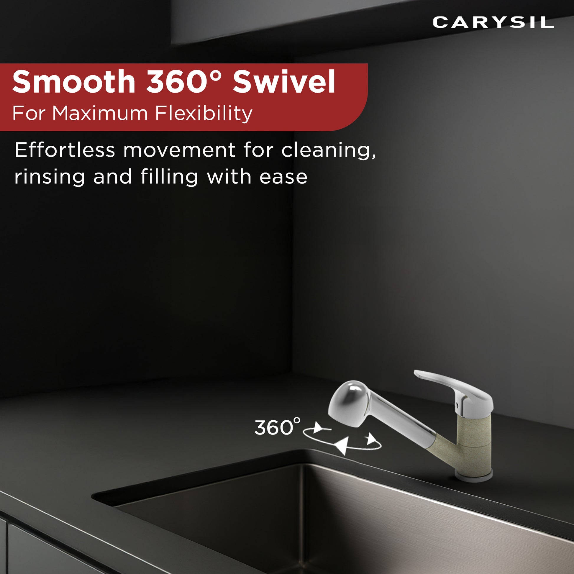 Upgrade your kitchen with the Carysil kitchen faucet featuring a sleek design and 360-degree swivel spout—ideal for pots and full sink access.