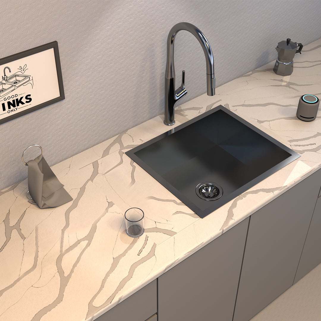 The Carysil stainless steel sink creates a modern and sleek look with sharp and right-angled corners makes it easier to clean and utilize effectively, adding both style and functionality to your kitchen.