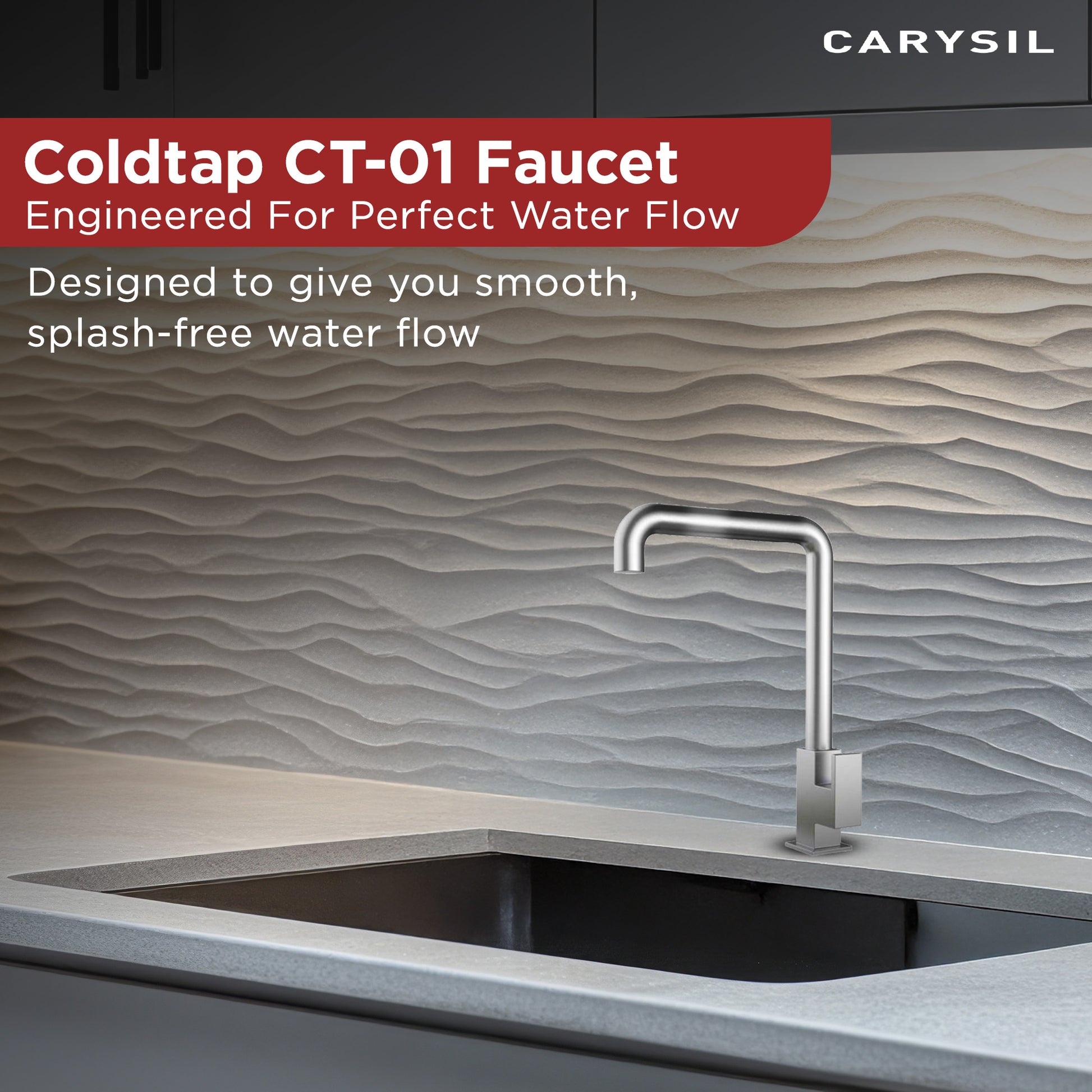 The Carysil faucet features intuitive single-lever operation for hot and cold water, enabling easy adjustment of water flow and temperature with a single smooth motion.