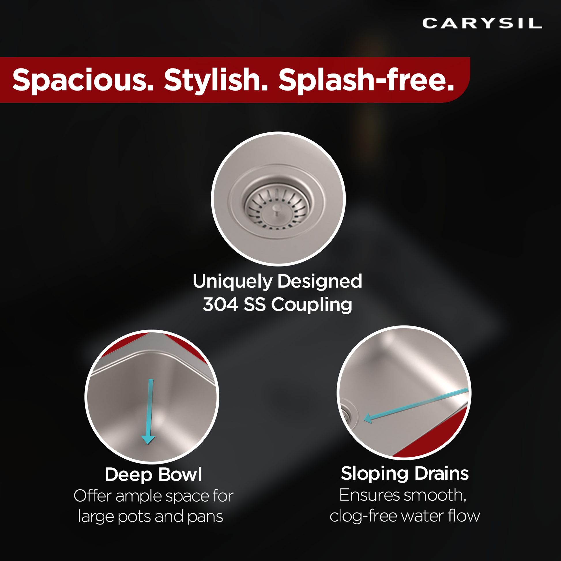 The deep bowl design engineered in the sink with sloping drains ensures smooth water flow, prevents splashes and pooling, and allows for efficient drainage and hassle-free cleaning after every use.
