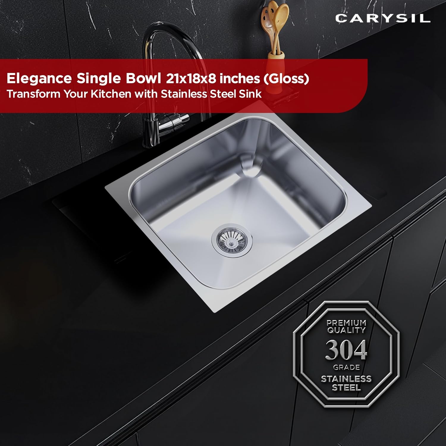 Carysil Elegance Series Single Bowl Kitchen Sink, Stainless Steel Kitchen Sink, 304 Stainless Steel Coupling, Noise Reduction Design, Deep Bowl with Sloping Drain, 21x18x8 inches, Glossy Finish
