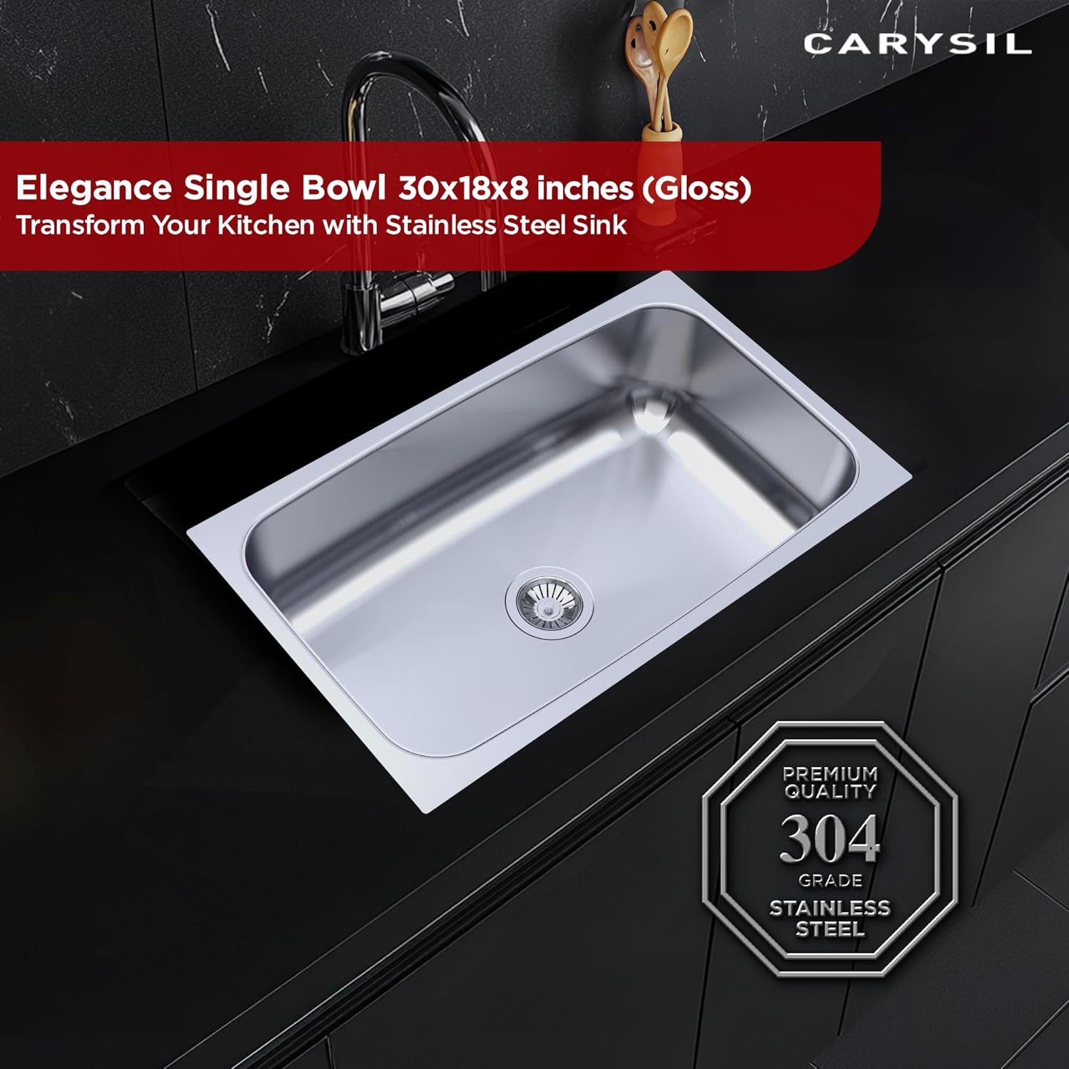 Carysil Elegance Series Single Bowl Kitchen Sink, Stainless Steel Kitchen Sink, 304 Stainless Steel Coupling, Noise Reduction Design, Deep Bowl with Sloping Drain, 30x18x8 inches, Glossy Finish