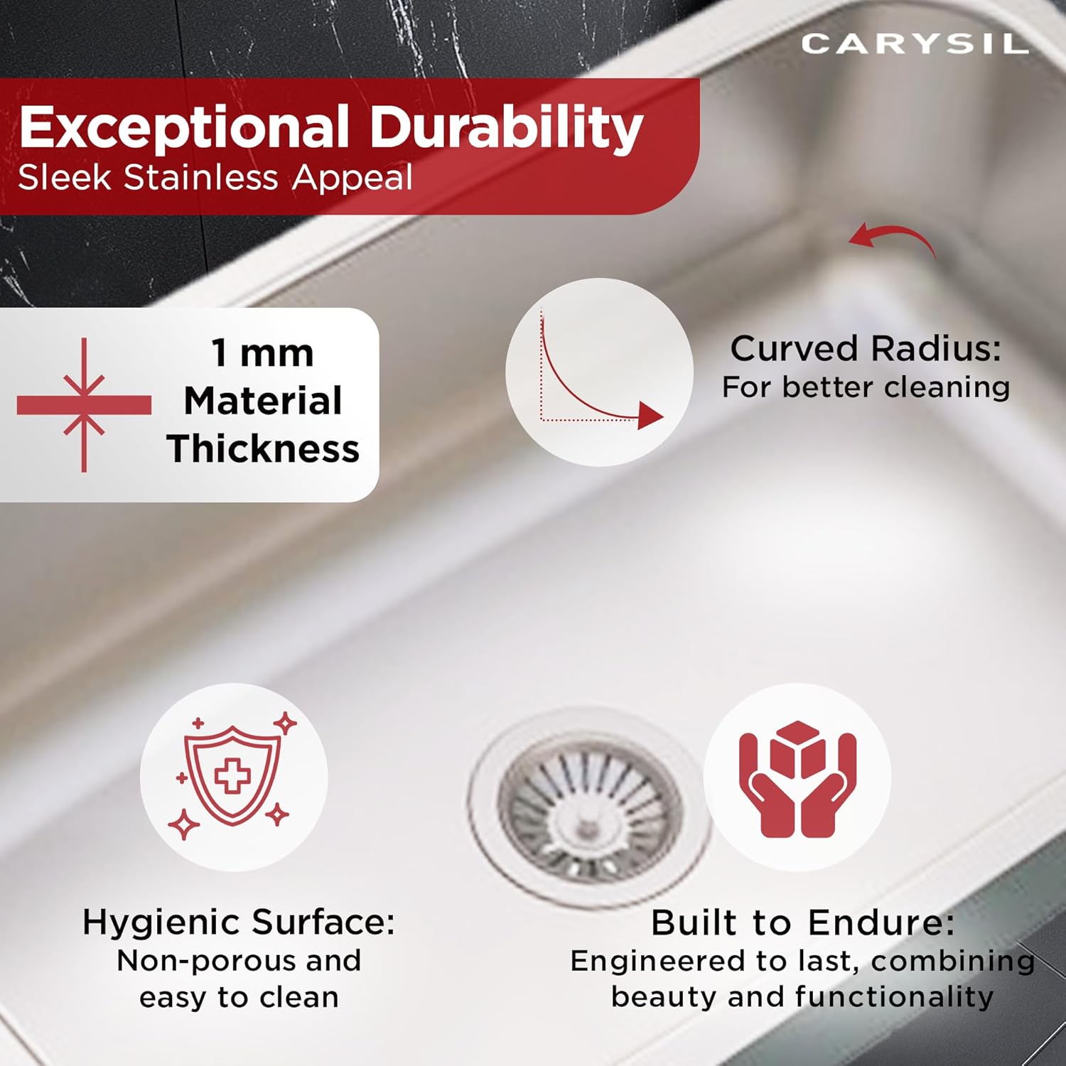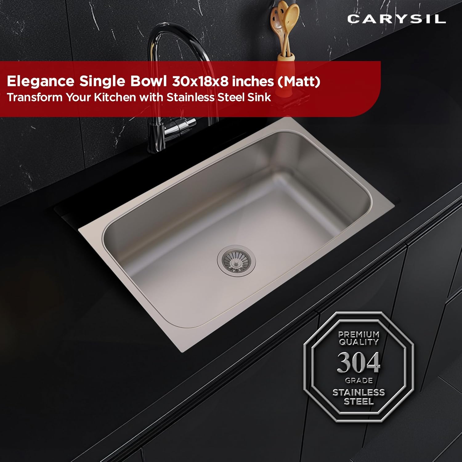 Carysil Elegance Series Single Bowl Kitchen Sink, Stainless Steel Kitchen Sink, 304 Stainless Steel Coupling, Noise Reduction Design, Deep Bowl with Sloping Drain, 30x18x8 inches, Matt Finish