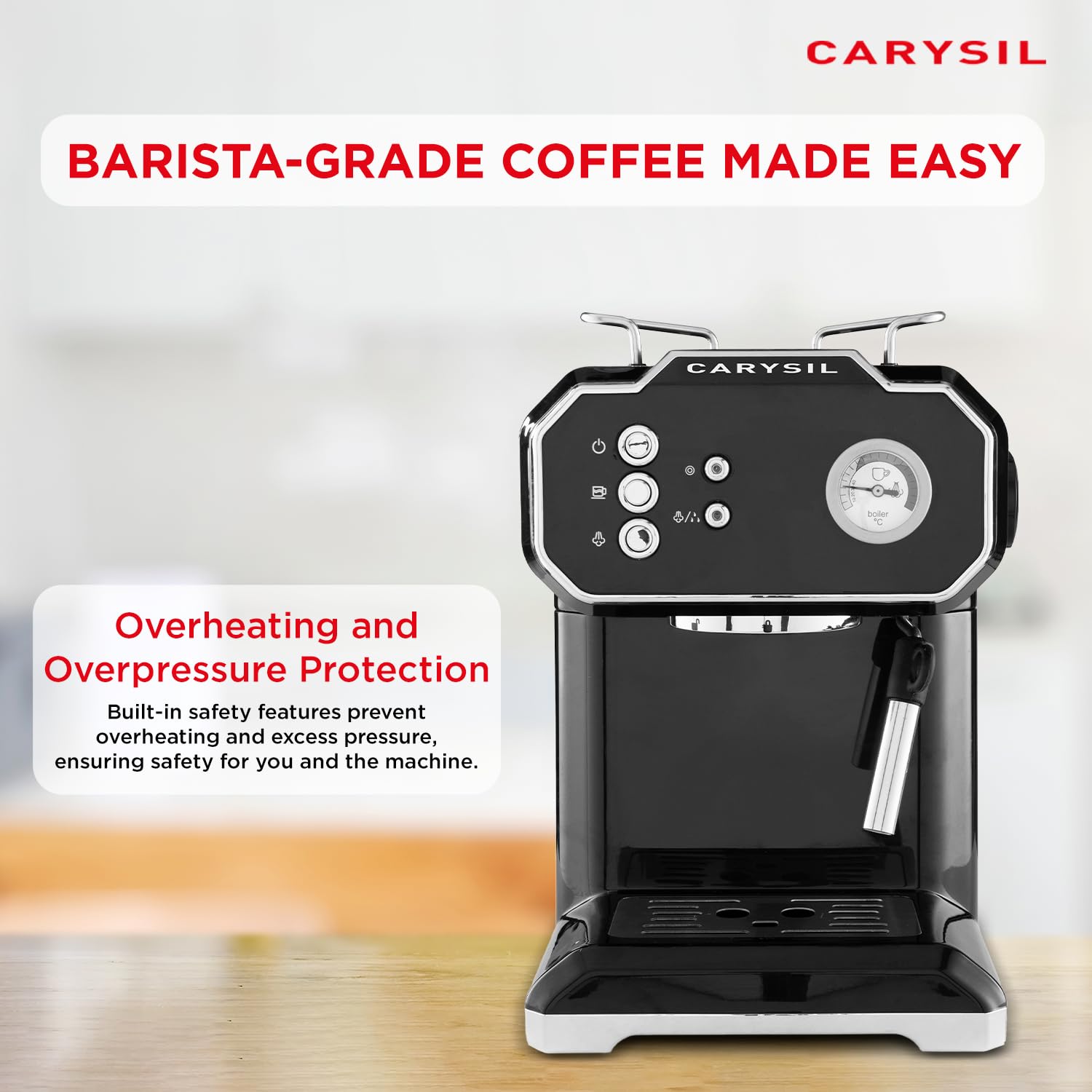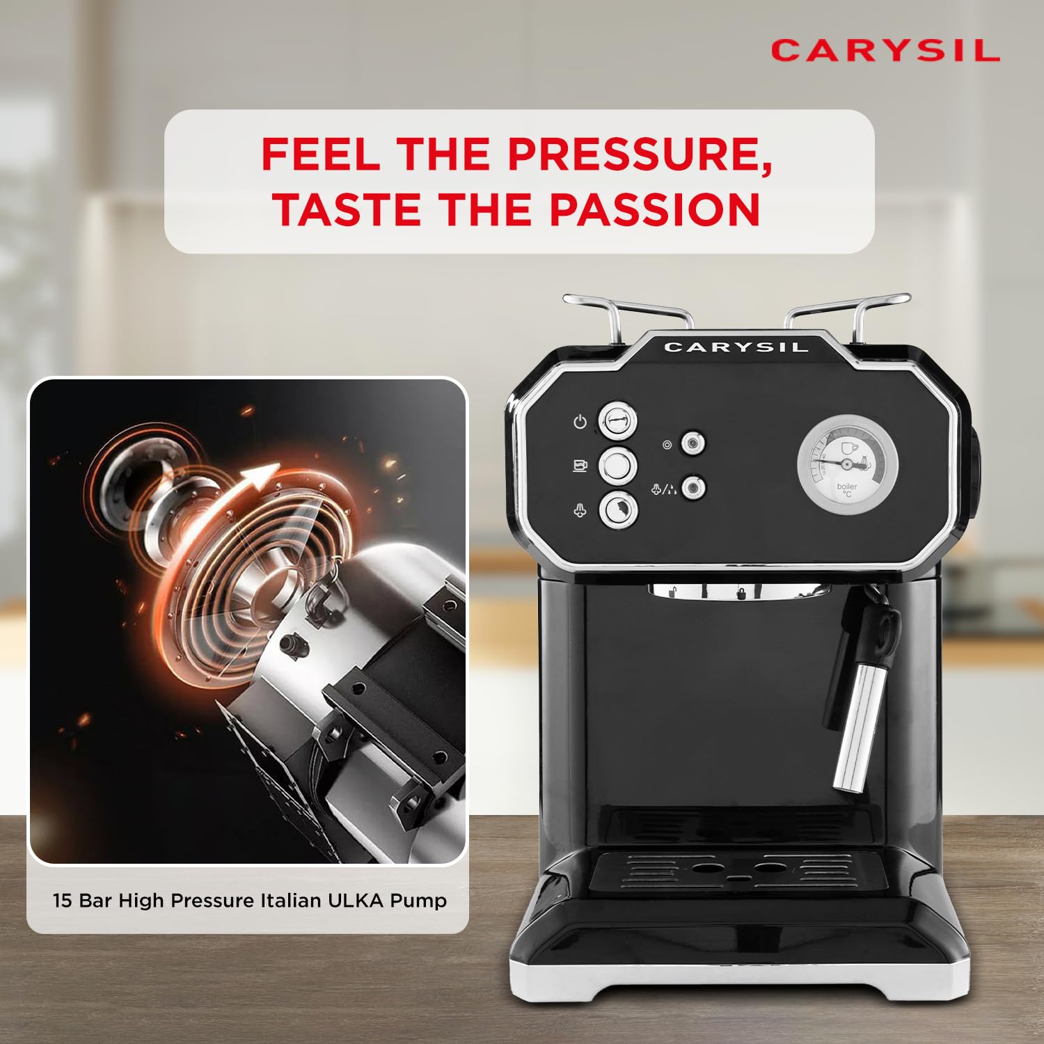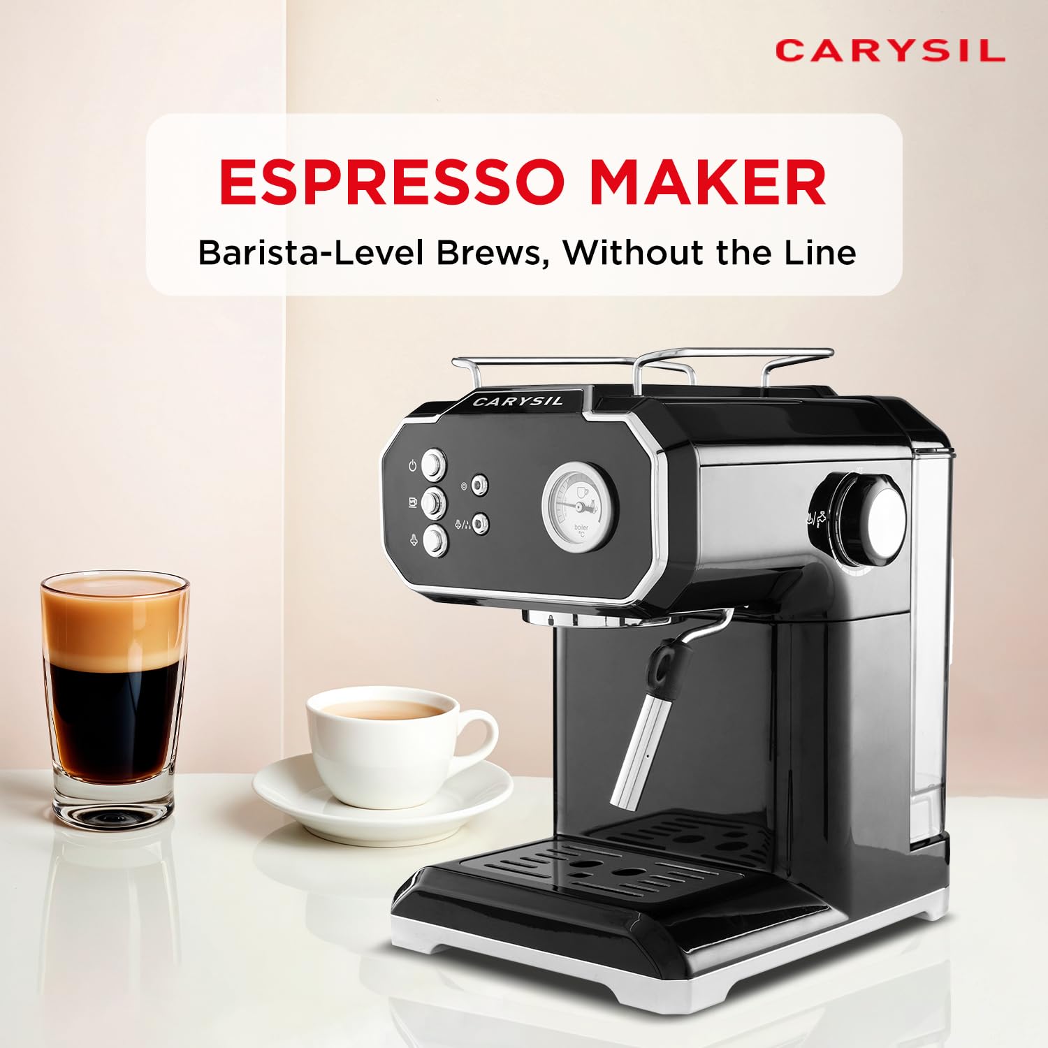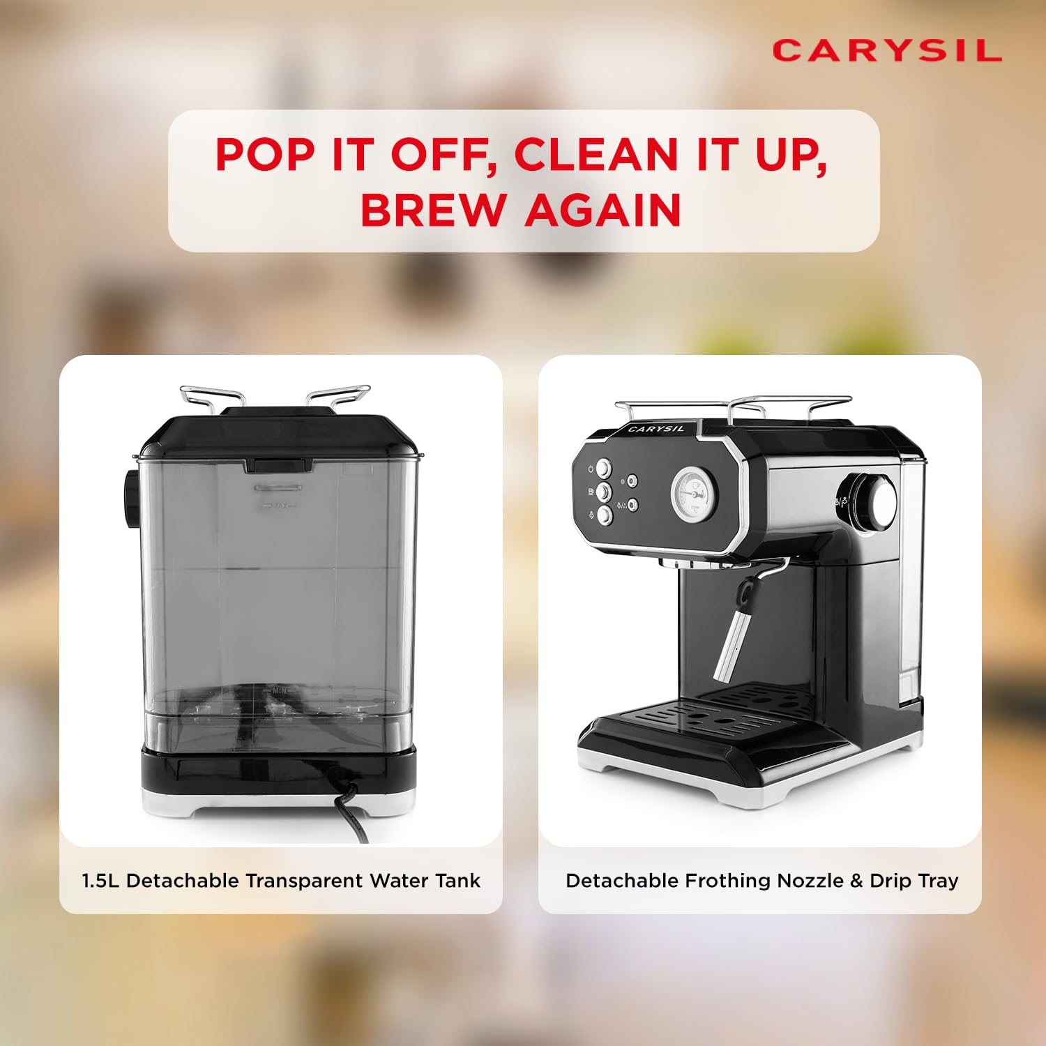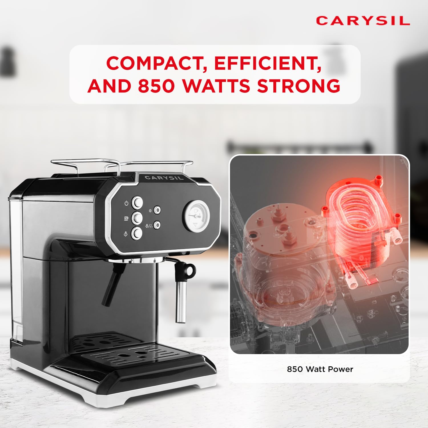 With an 850-watt power rating, the Carysil espresso machine heats up quickly and delivers efficient brewing and steam production. Whether you're craving a quick espresso shot or frothy cappuccino, the fast heating ensures a seamless and convenient coffee-making experience, without any long wait times