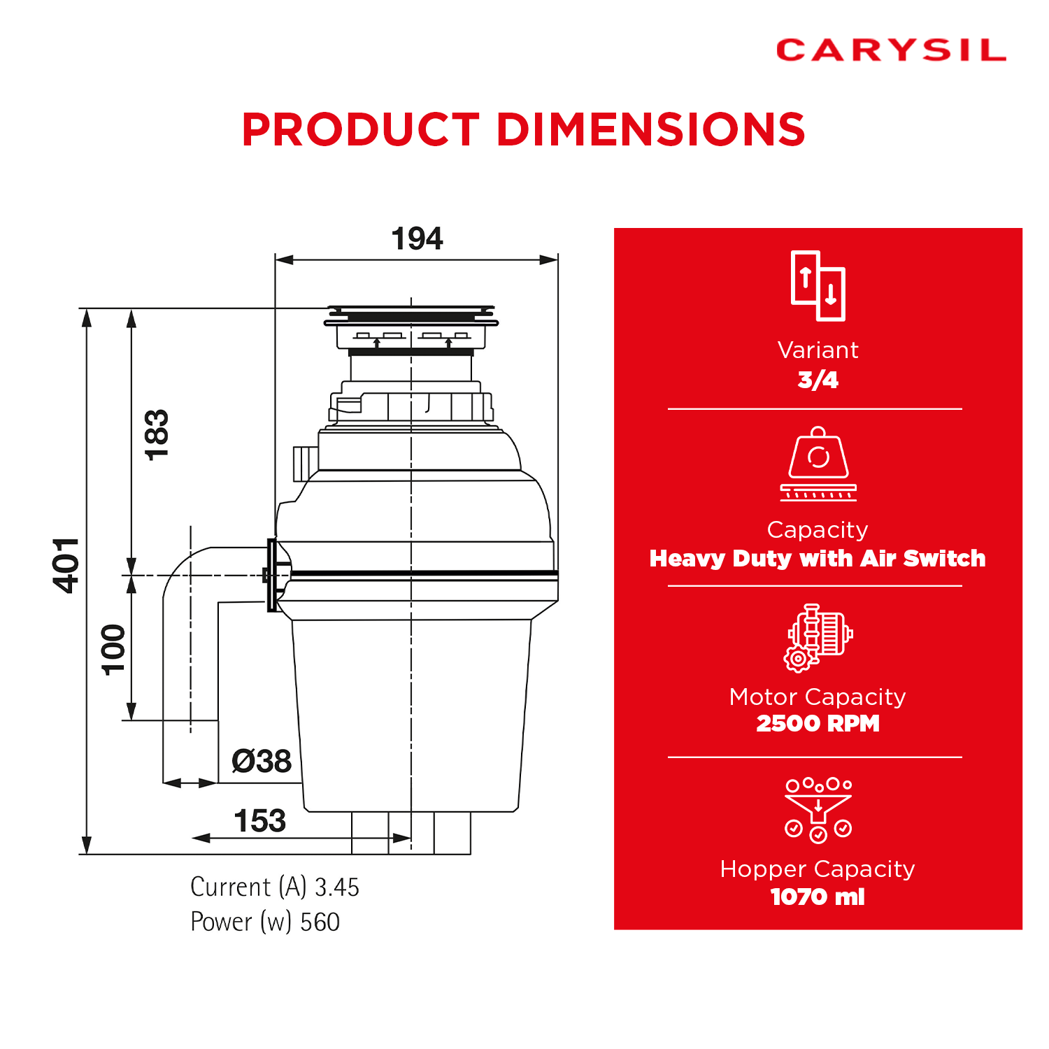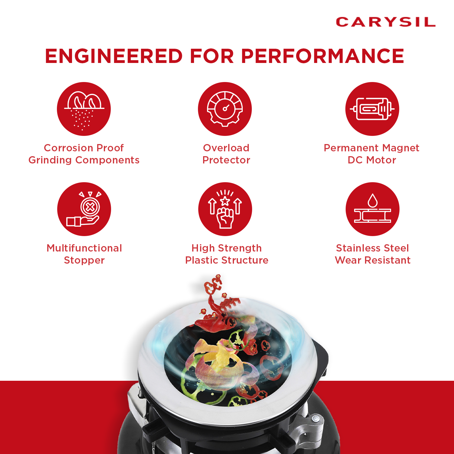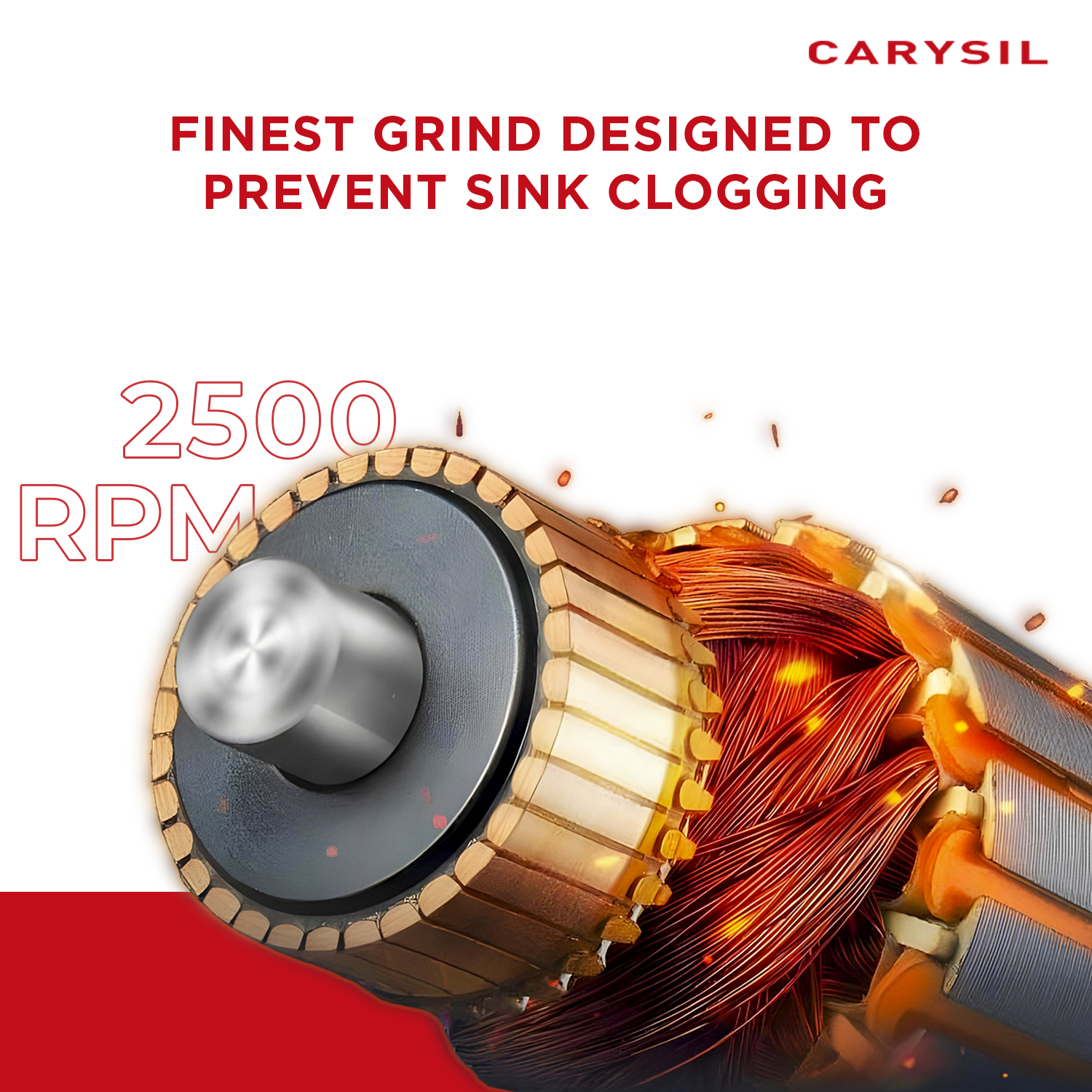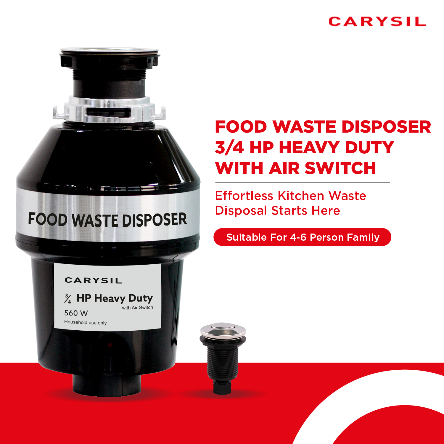 Carysil Food Waste Disposer for Home Sink, 3/4 HP Heavy Duty with Air Switch, Ideal for 8-12 Person Family, Powerful 2500 RPM DC Motor with Low Noise, Corrosion-Proof & Stainless Steel Grinding Components, Fits Under The Kitchen Sink, Black