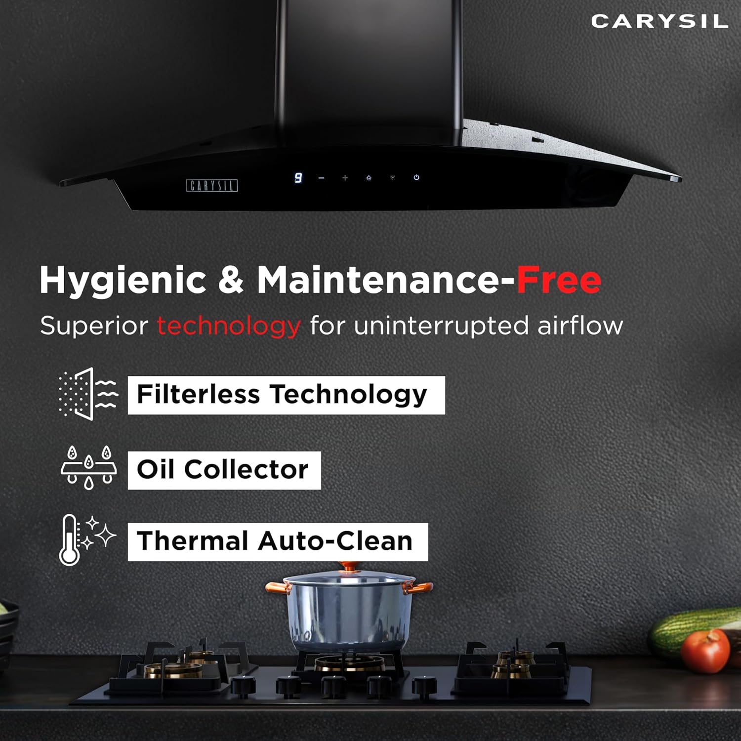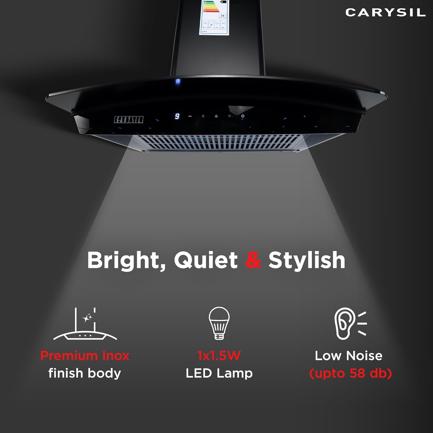 Carysil Milan 60 cm Kitchen Chimney, Curved Shape, 1200 m³/hr Suction Capacity, Filterless, BLDC Silent Motor, Heat Auto Clean, 9-speed Motion Sensor, A-Energy Class, LED Lamp, 12-year Motor Warranty