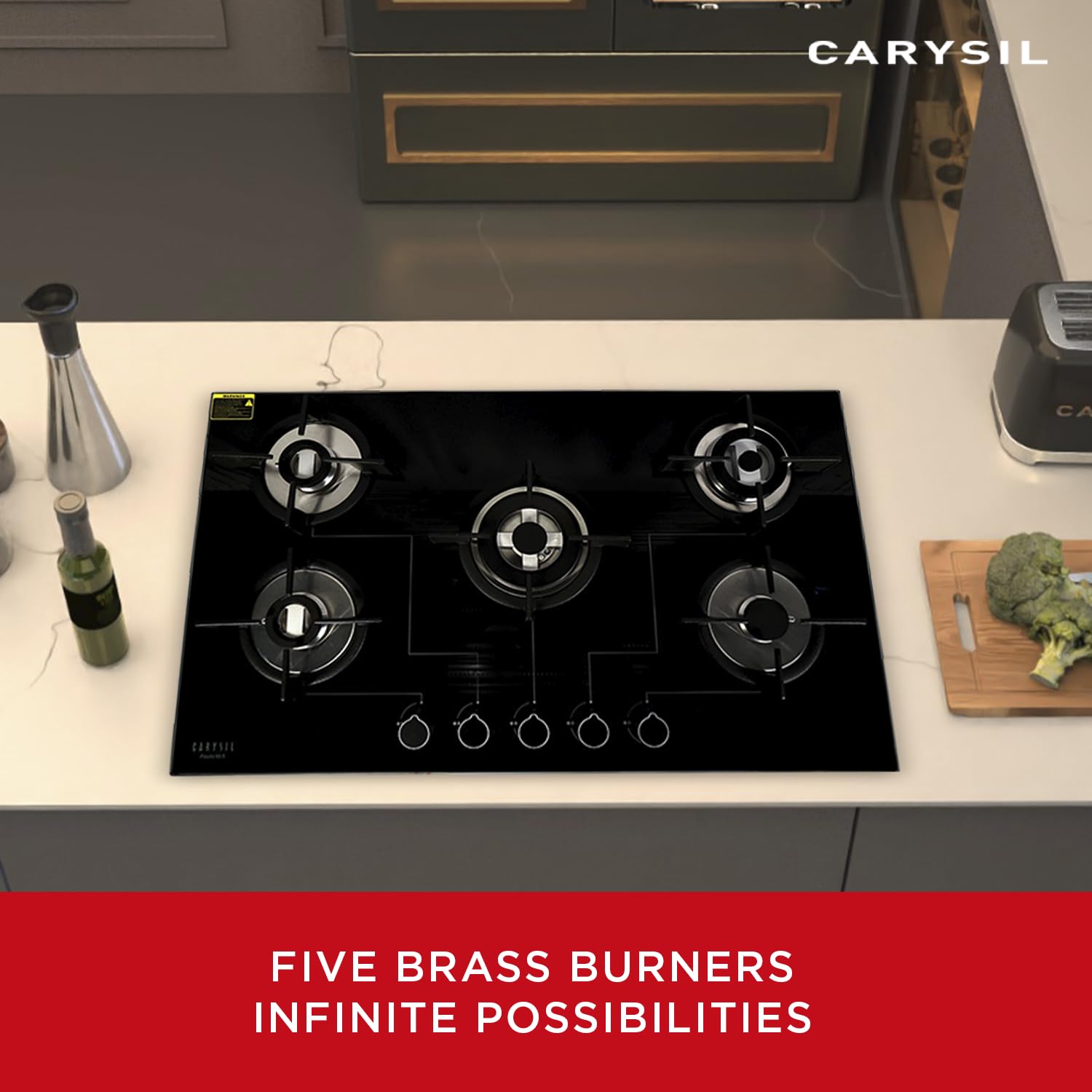 The built-in hob features 5 brass burners for high-speed heat, delicate simmering and adjustable heat spread. It includes 1 big triple ring burner, 1 mini triple ring burner, 2 medium ring burner and 1 small ring burner. This setup ensures even heat distribution, precise temperature control, making your kitchen tasks faster, easier, and more efficient.