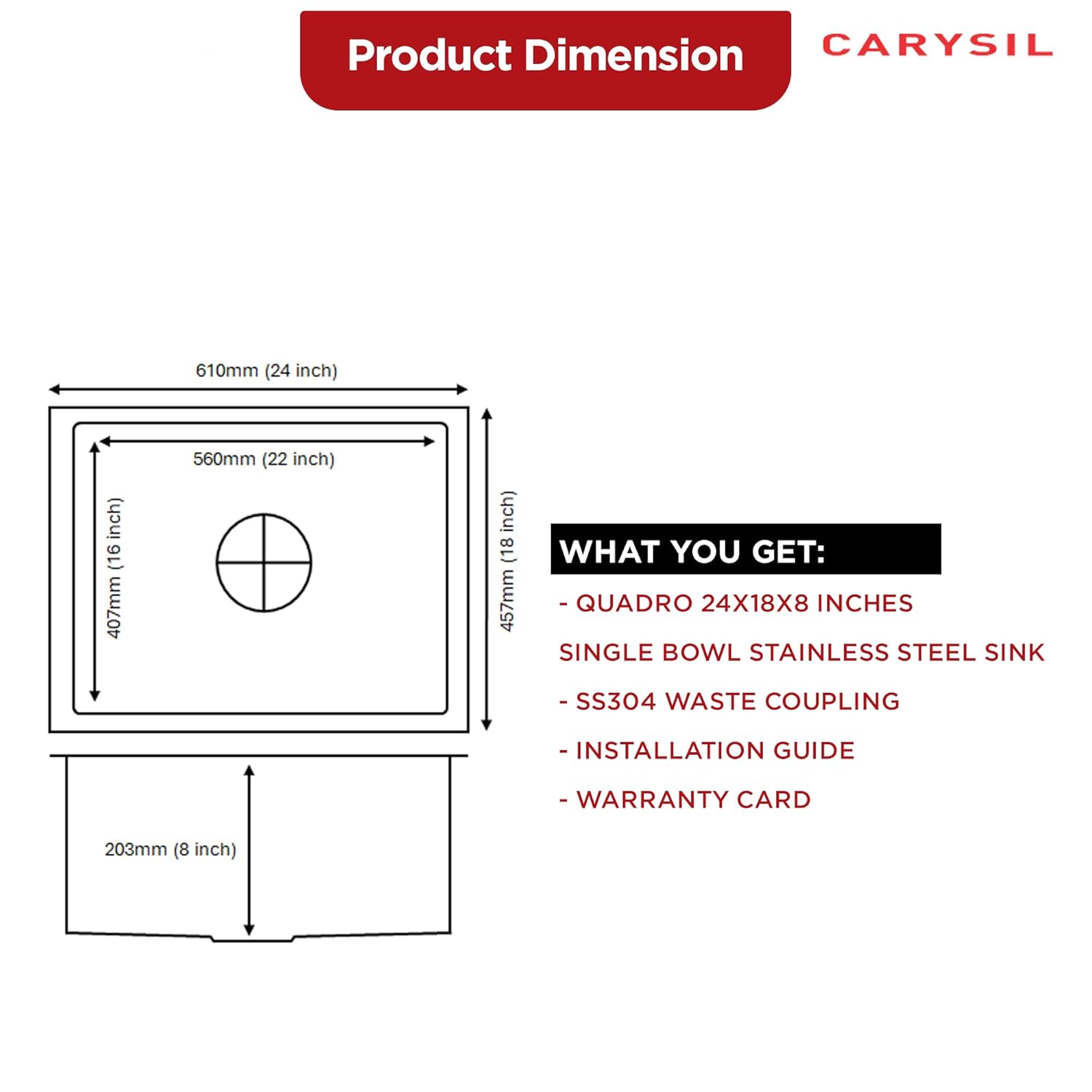 Carysil Quadro Series Zero Radius Single Bowl Kitchen Sink, Stainless Steel Kitchen Sink, 304 Coupling, Noise Reduction Design, Deep Bowl with Sloping Drain, 24x18x8 inches, Satin Finish