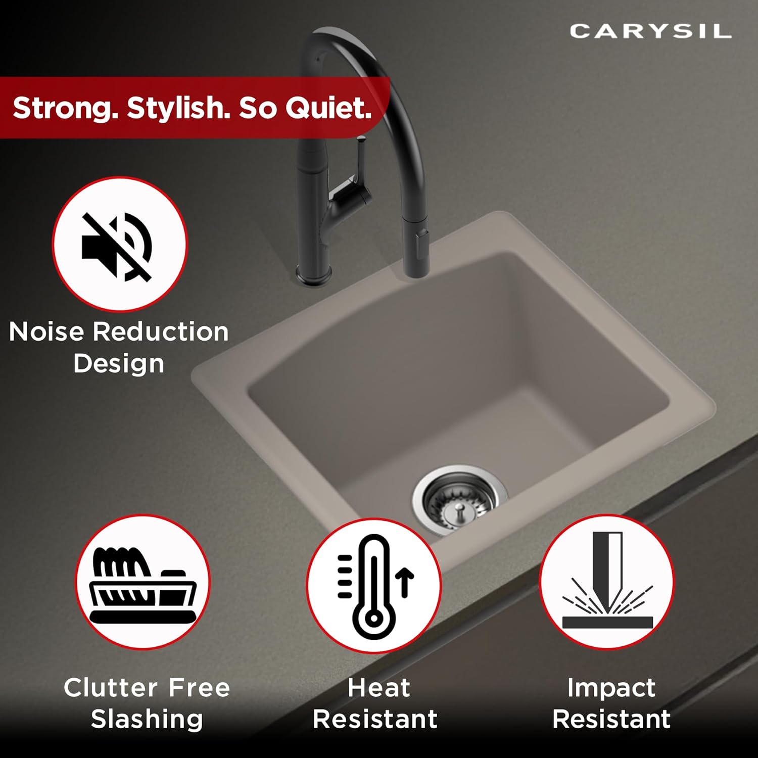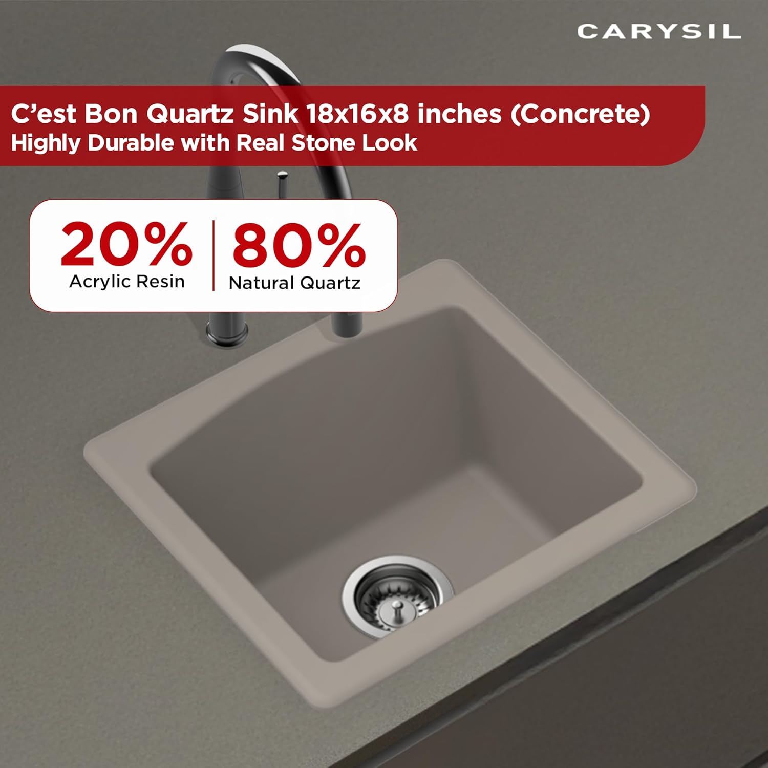 Carysil Quartz C'est Bon Single Bowl Kitchen Sink, Real Stone Finish, 304 Stainless Steel Coupling, Kitchen Sink with Sloping Drain, Noise Reduction Design, 18x16x8 inches, Concrete