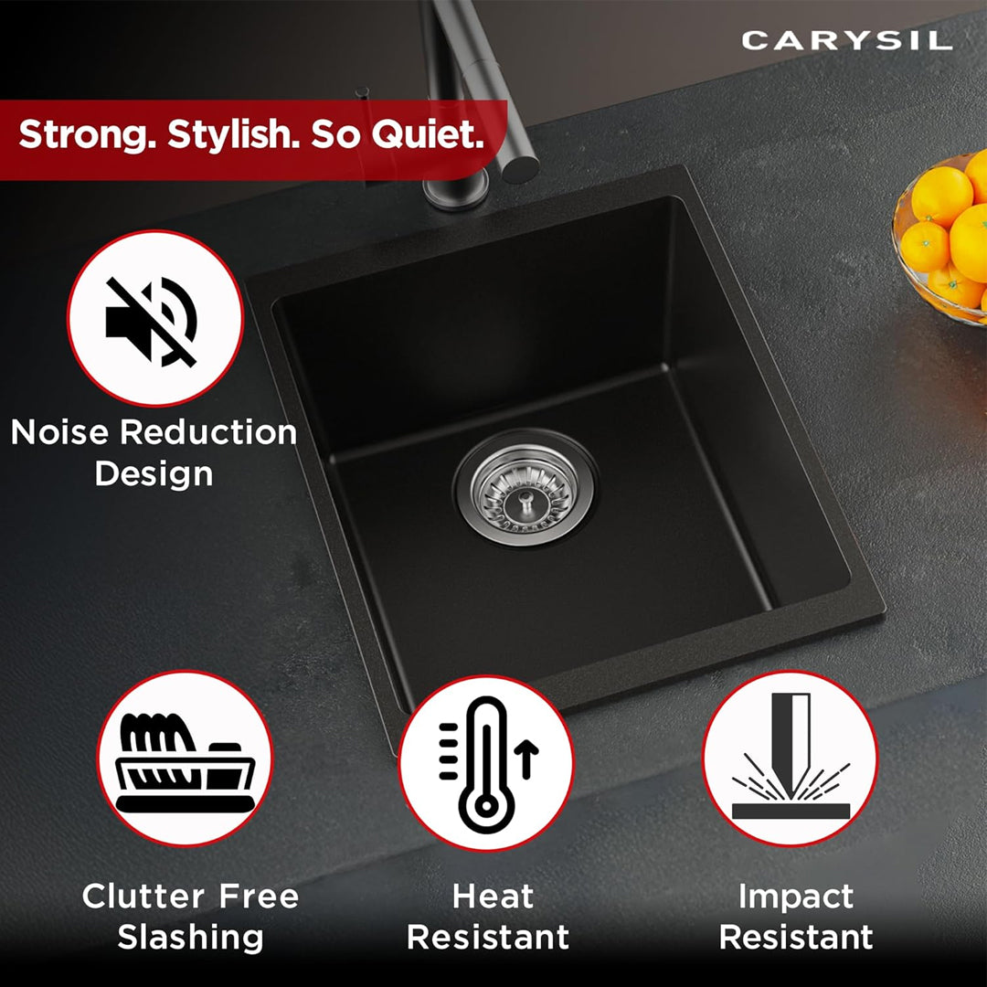 Carysil Quartz Dolce UK Series Single Bowl Kitchen Sink with 50 ml Cleaning Kit, Real Stone Finish, 304 Stainless Steel Coupling, Kitchen Sink with Sloping Drain, Noise Reduction Design, 15x18x8 inches, Pearl Black