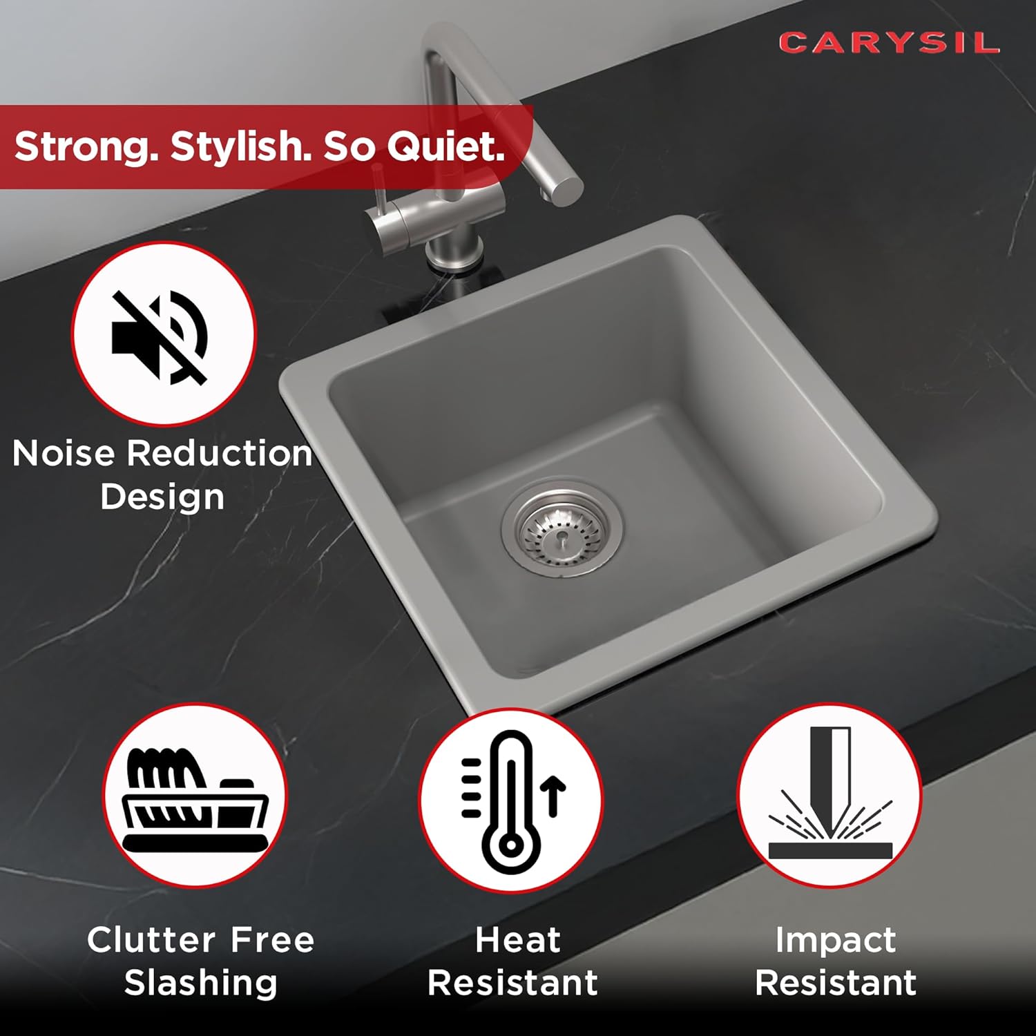 Carysil Quartz Neo Salsa Single Bowl Kitchen Sink, Real Stone Finish, 304 Stainless Steel Coupling, Kitchen Sink with Sloping Drain, Noise Reduction Design, 17x17x8 inches, Basalt Grey