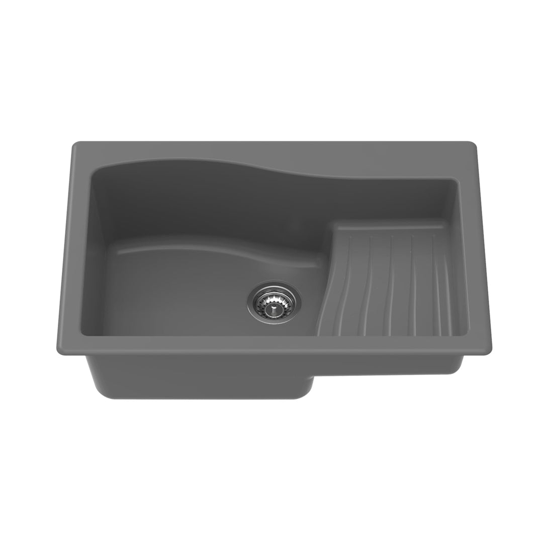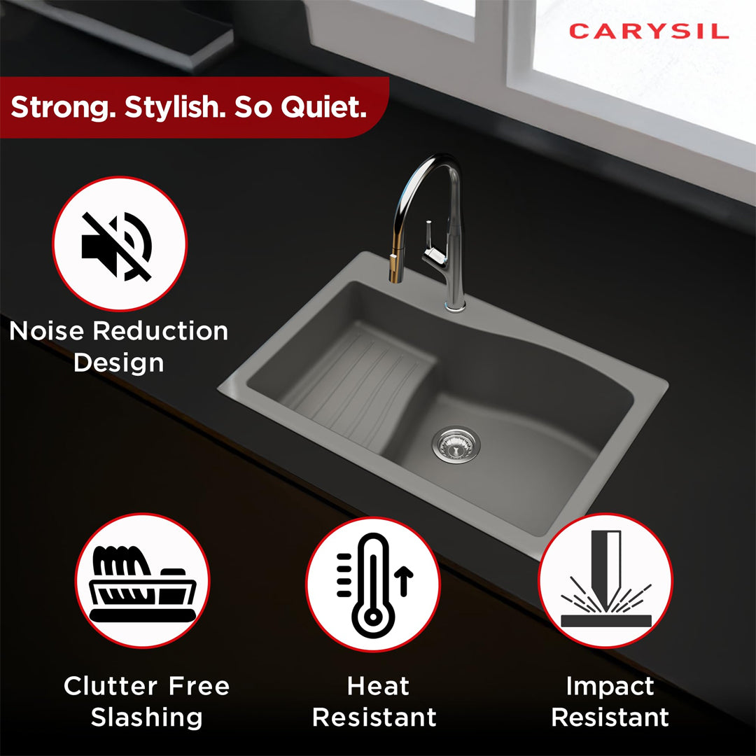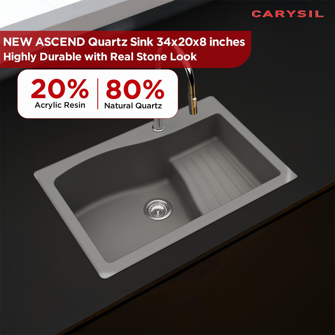 Carysil Quartz New Ascend Single Bowl Kitchen Sink, Real Stone Finish, 304 Stainless Steel Coupling, Kitchen Sink with Sloping Drain, Noise Reduction Design, 34x20x8 inches, Basalt Grey