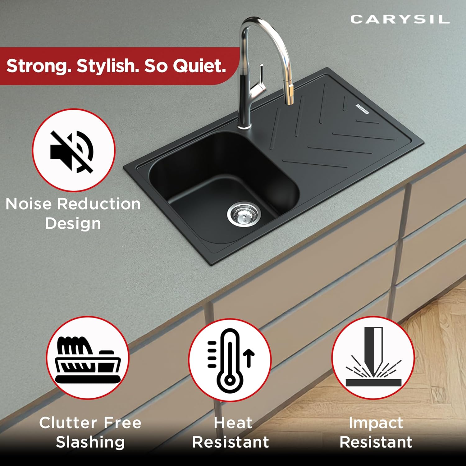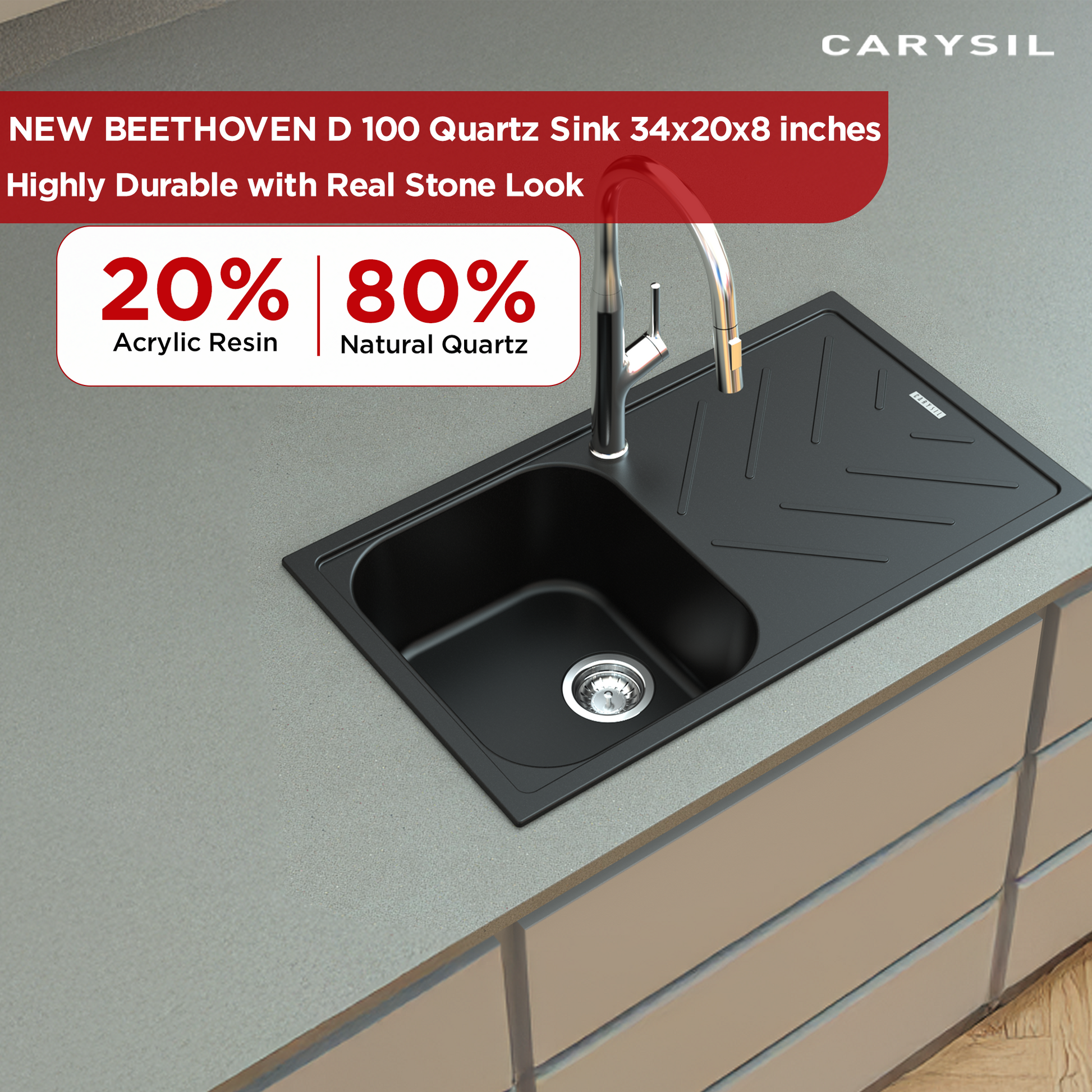 Made from 80% natural quartz and 20% acrylic resin, the Carysil quartz kitchen sink gives a natural stone-like appearance that enhances your kitchen and is very durable. It is scratch, chip, and stain resistant, ensuring that your kitchen centrepiece remains stunning and reliable for years to come.