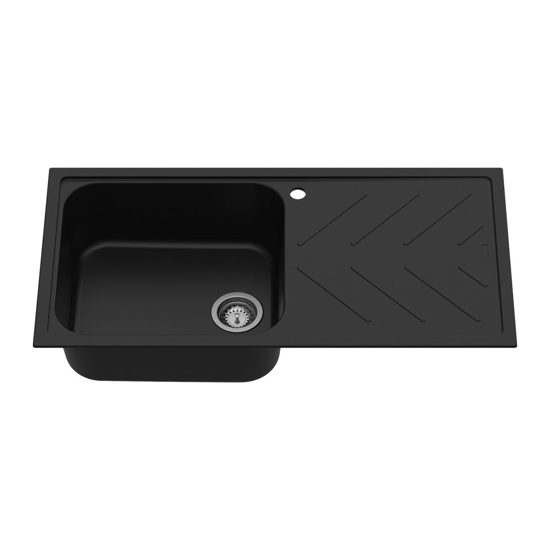 Carysil Quartz New Beethoven D 100L Kitchen Sink with Drainboard, Real Stone Finish, 304 Waste Coupling with 50 ml Cleaning Kit, Kitchen Sink with Sloping Drain, Noise Reduction Design, 40x20x8 inches, Pearl Black