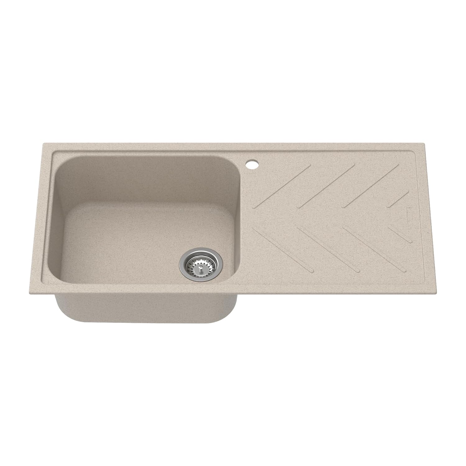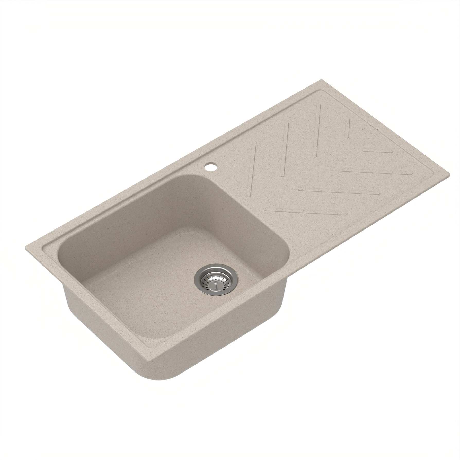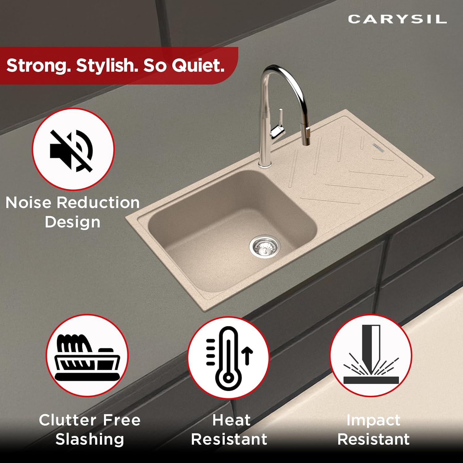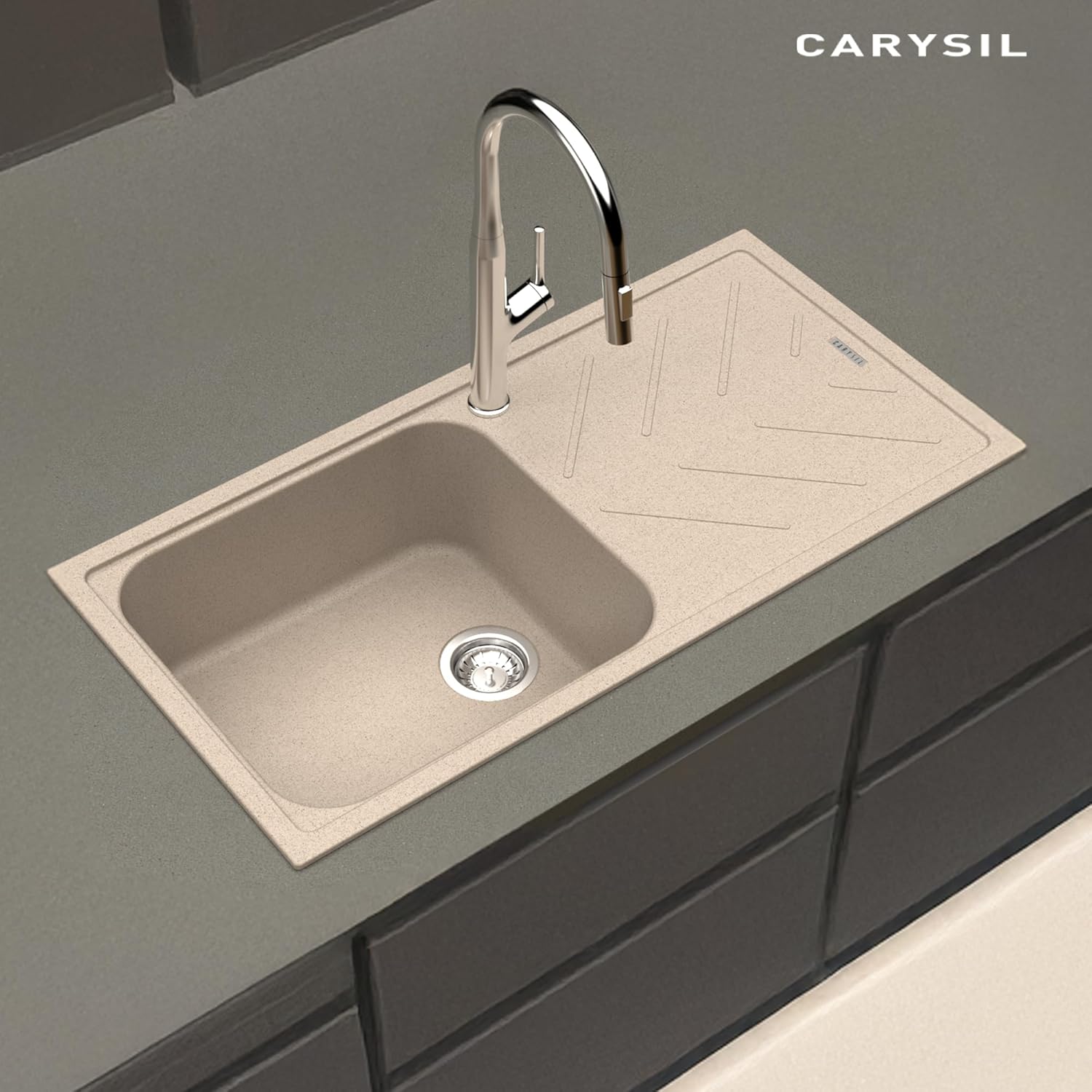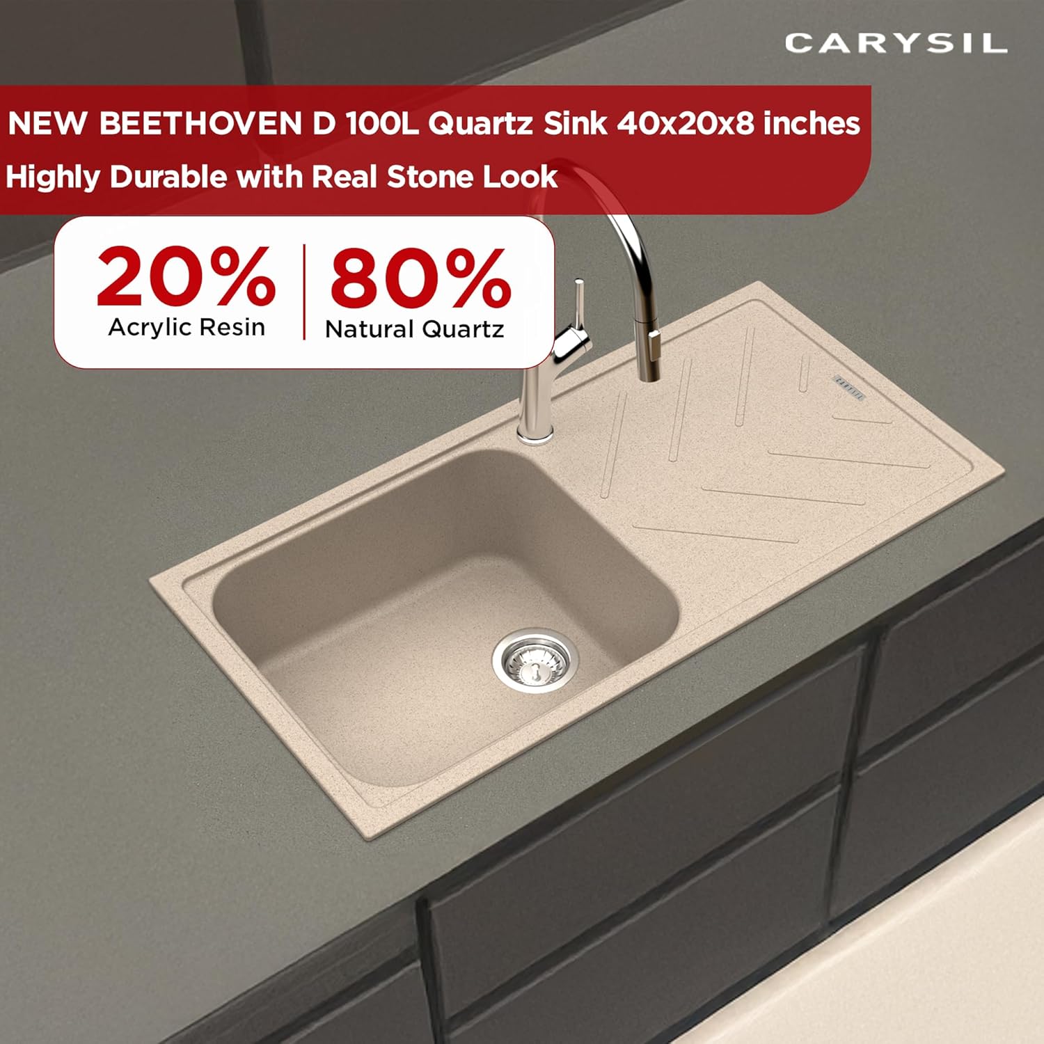 Carysil Quartz New Beethoven D 100L Kitchen Sink with Drainboard, Real Stone Finish, 304 Stainless Steel Coupling, Kitchen Sink with Sloping Drain, Noise Reduction Design, 40x20x8 inches, Sand