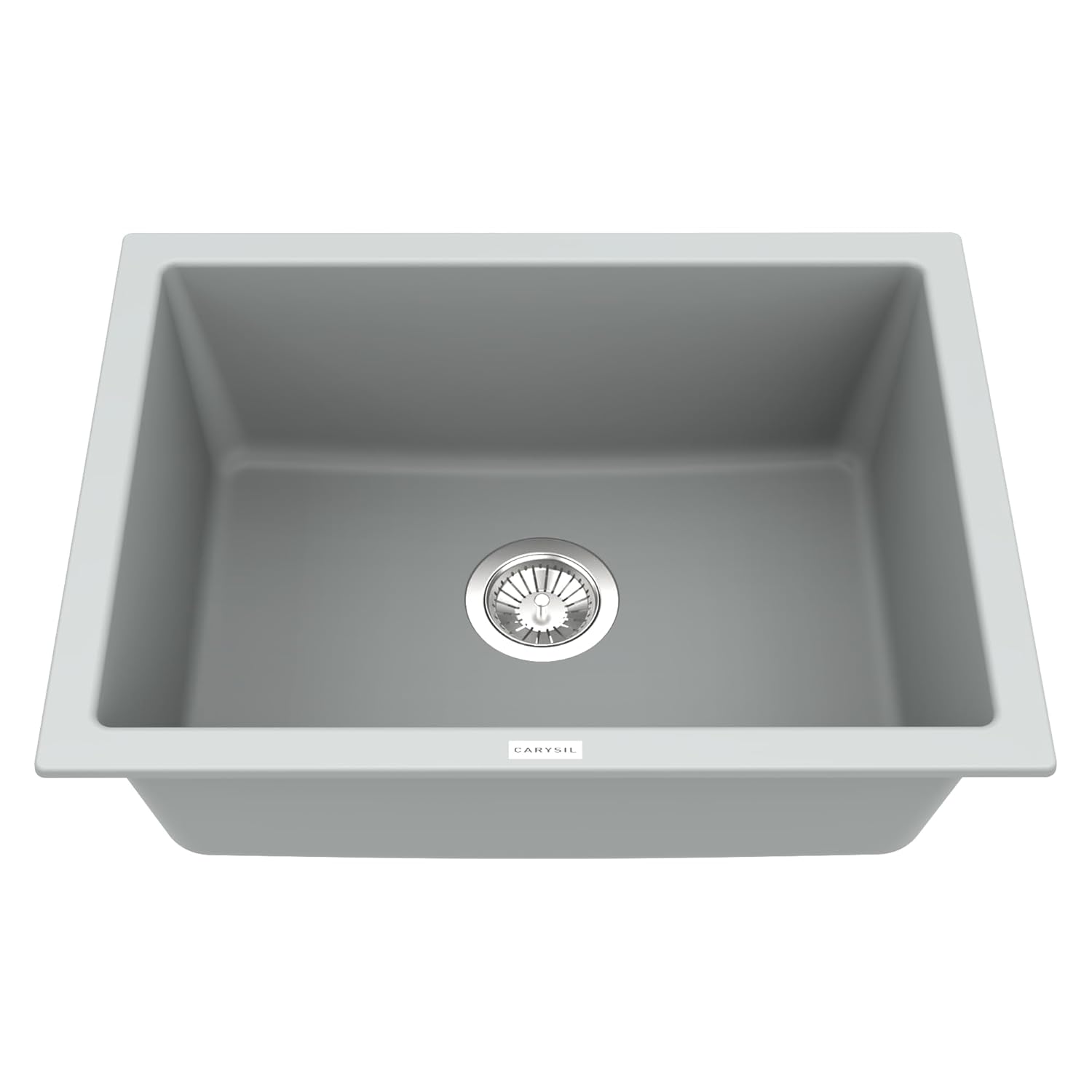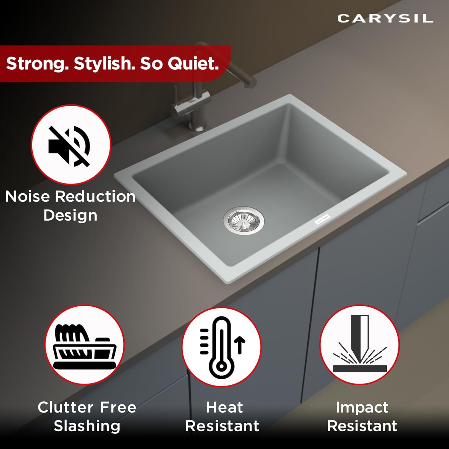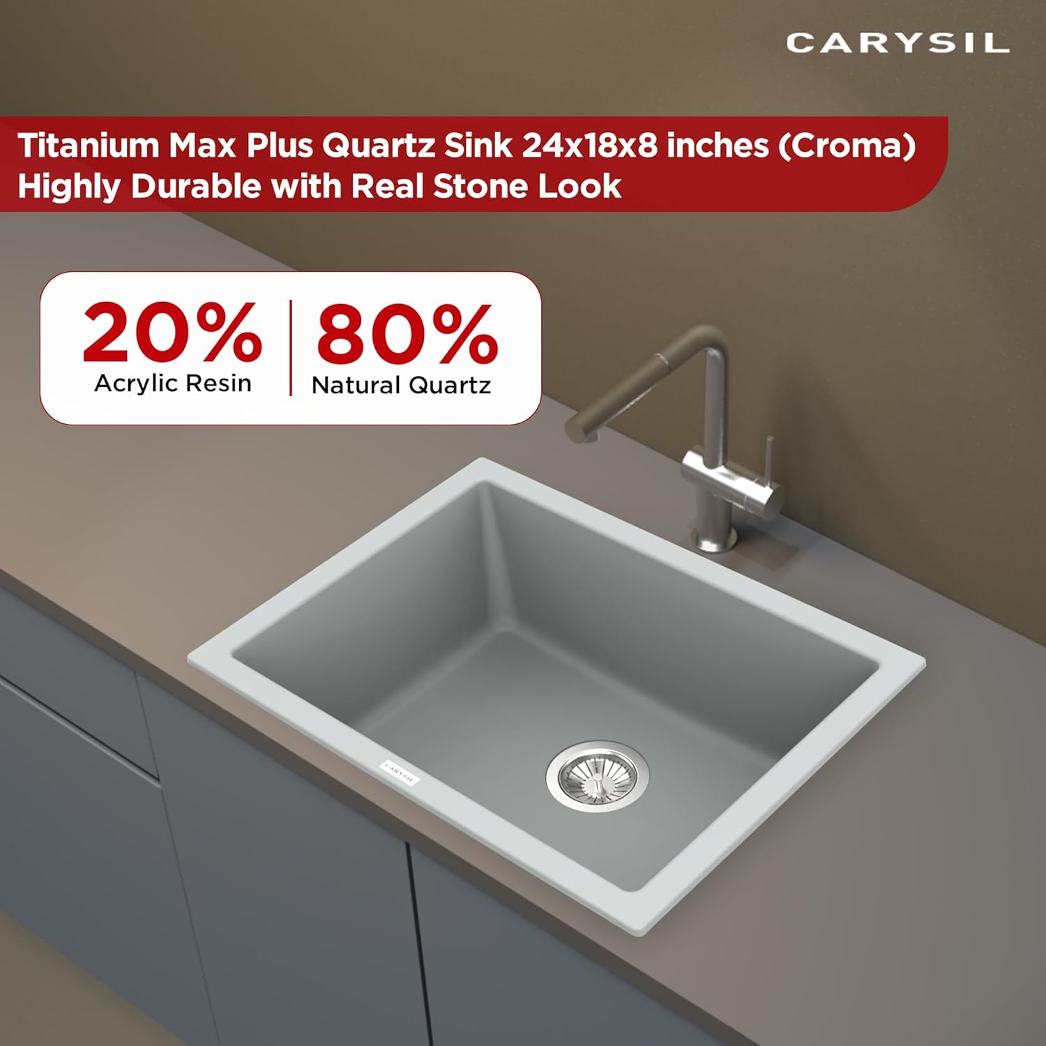 Carysil Quartz Titanium Max Plus Series Single Bowl Kitchen Sink, Real Stone Finish, 304 Stainless Steel Coupling, Kitchen Sink with Sloping Drain, Noise Reduction Design, 24x18x8 inches, Croma