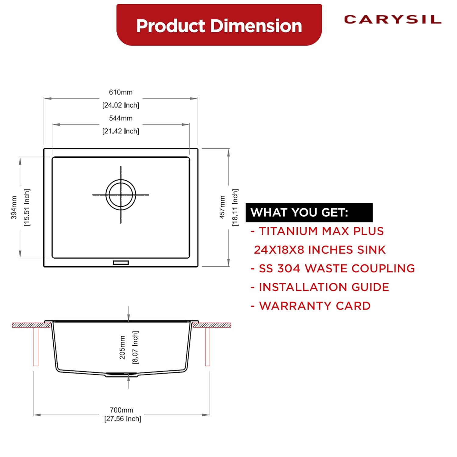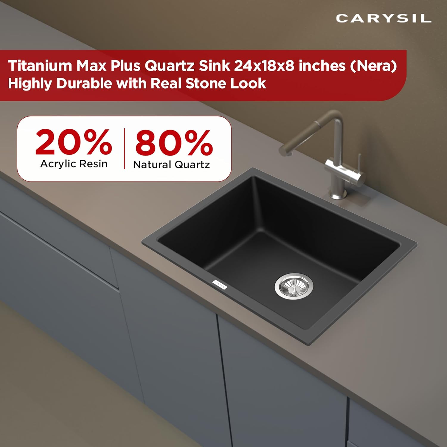Carysil Quartz Titanium Max Plus Series Single Bowl Kitchen Sink, Real Stone Finish, 304 Stainless Steel Coupling, Kitchen Sink with Sloping Drain, Noise Reduction Design, 24x18x8 inches, Nera