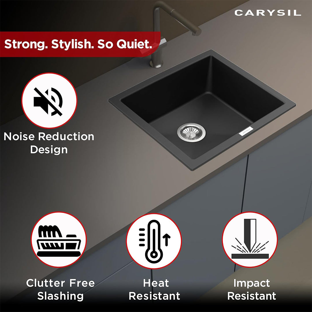Made from 80% natural quartz and 20% acrylic resin, the Carysil quartz kitchen sink gives a natural stone-like appearance that enhances your kitchen and is very durable. It is scratch, chip, and stain resistant, ensuring that your kitchen centerpiece remains stunning and reliable for years to come.