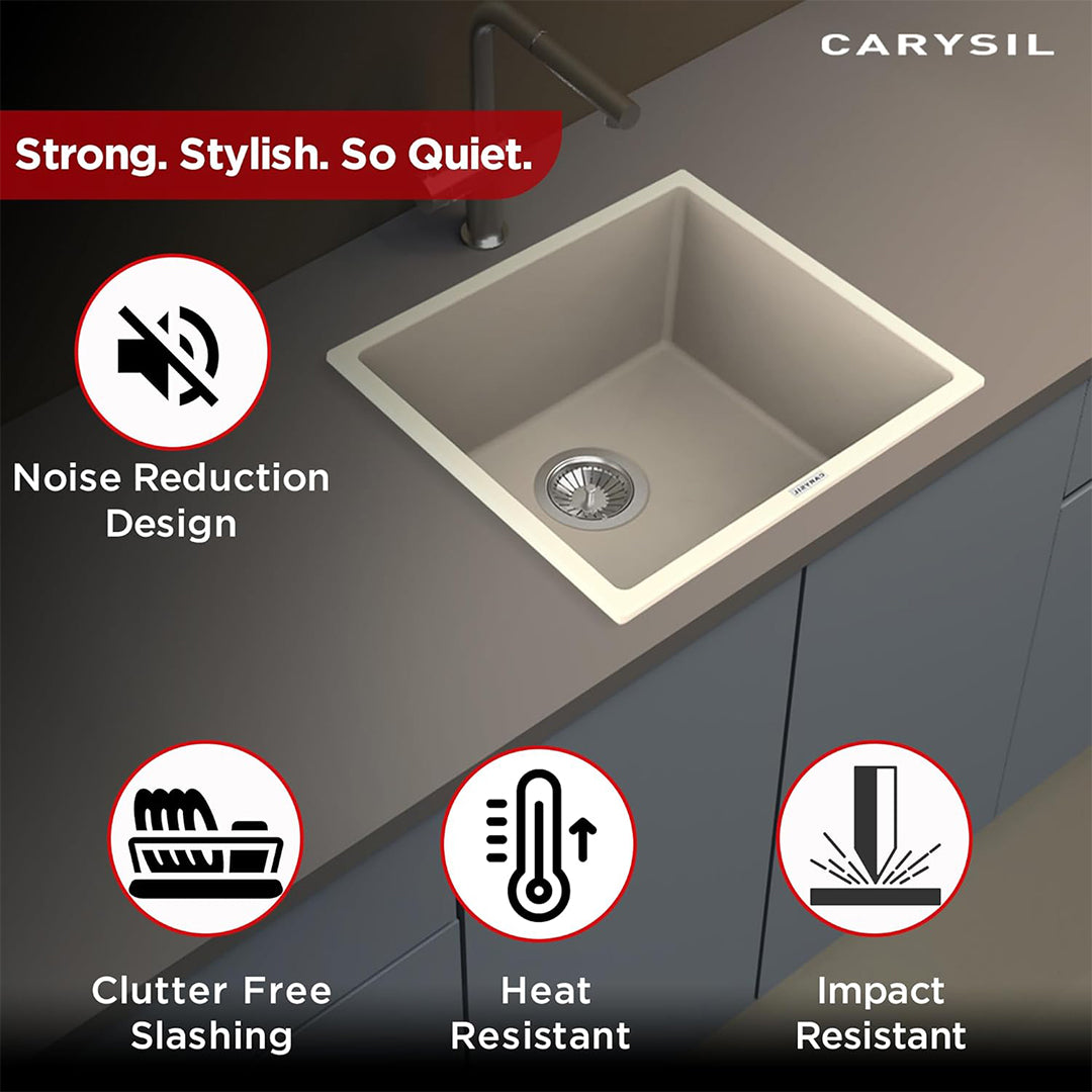 Made from 80% natural quartz and 20% acrylic resin, the Carysil quartz kitchen sink gives a natural stone-like appearance that enhances your kitchen and is very durable. It is scratch, chip, and stain resistant, ensuring that your kitchen centerpiece remains stunning and reliable for years to come.