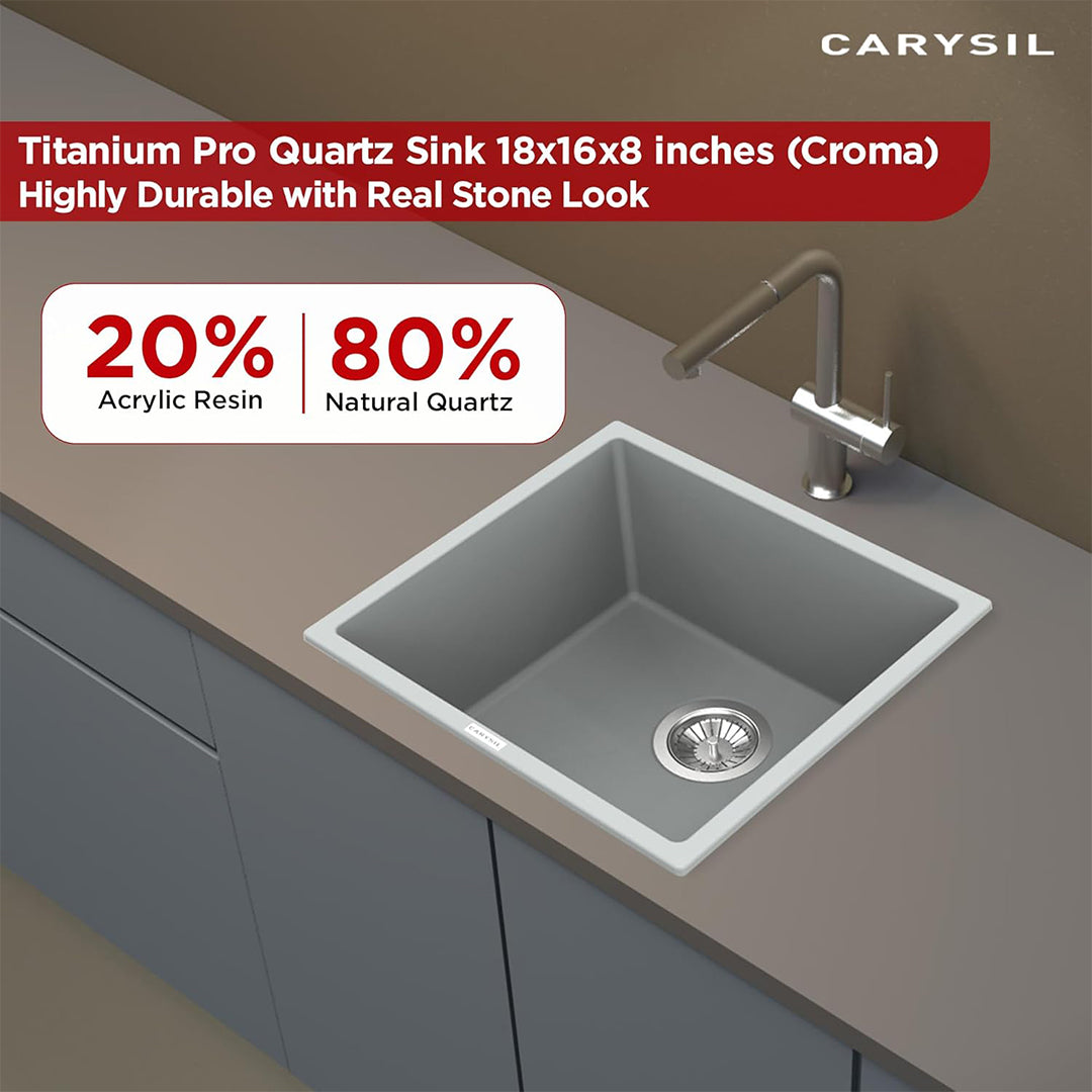 Carysil Quartz Titanium Pro Series Single Bowl Kitchen Sink, Real Stone Finish, 304 Stainless Steel Coupling, Kitchen Sink with Sloping Drain, Noise Reduction Design, 18x16x8 inches, Croma