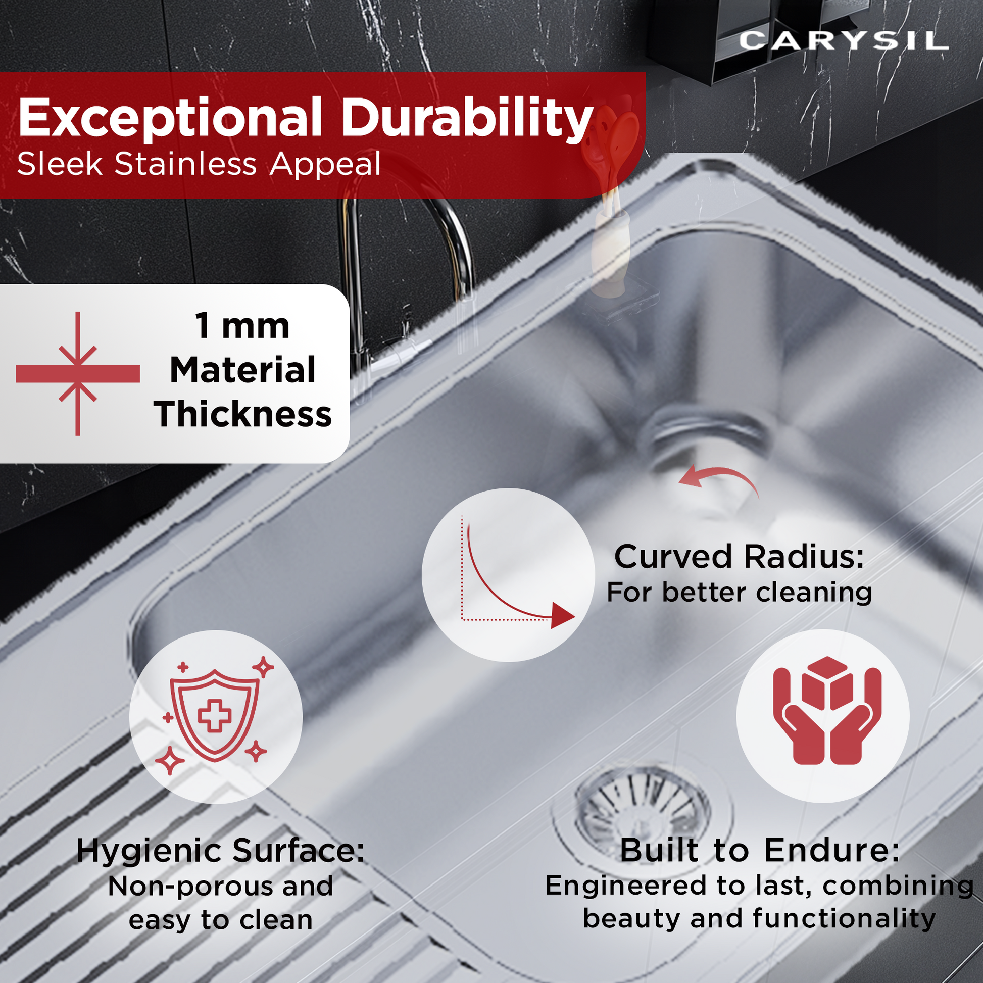For any assistance, you can reach us on our toll-free number at 1800 123 12 8833 or contact us via WhatsApp at +91 75069 90911. You may also drop us an email at hello@carysil.com, and our team will assist you. We’re happy to help with any inquiries or support needs related to your Carysil stainless steel kitchen sink. Please note that Installations, Services & Accessories will be chargeable as per Service Policy.